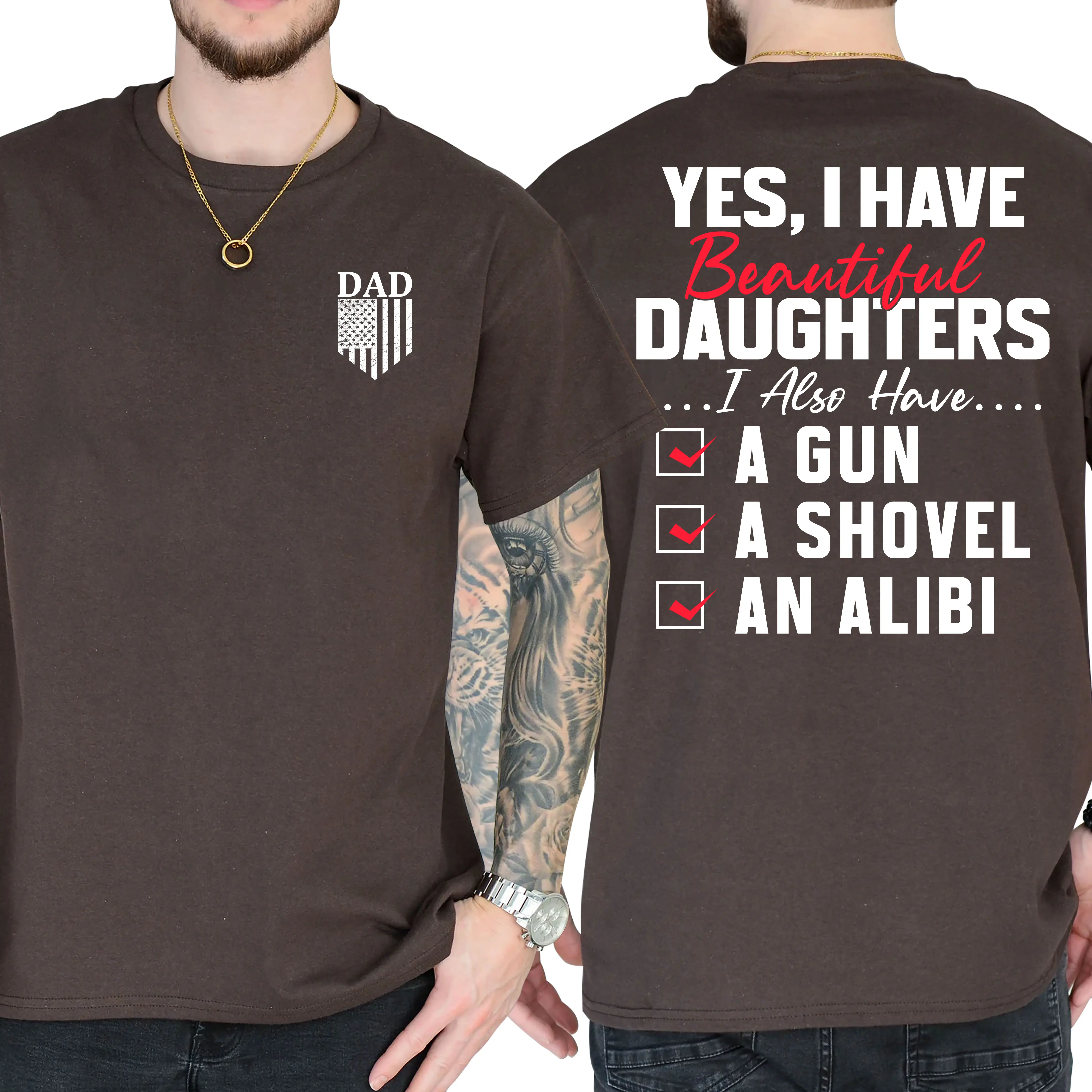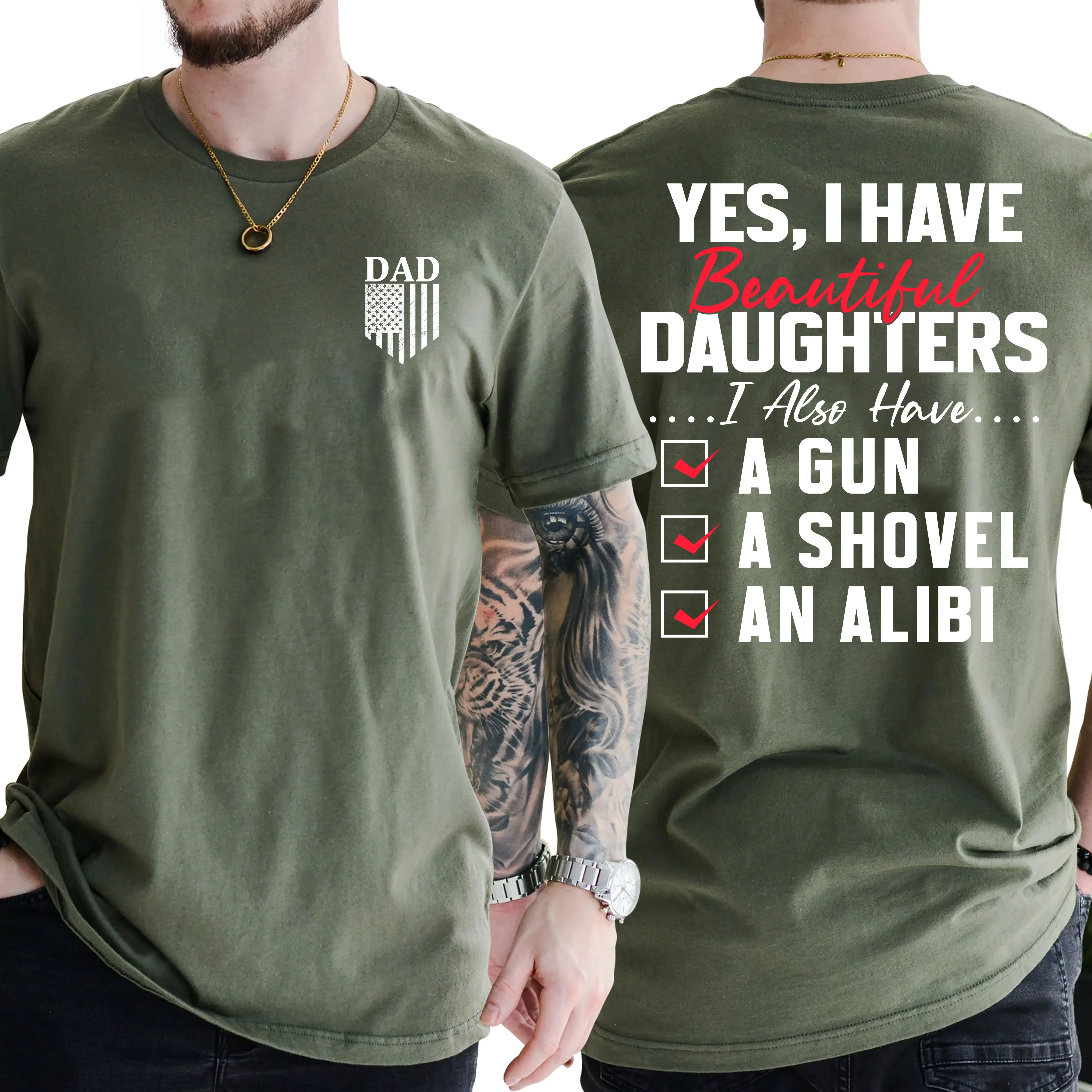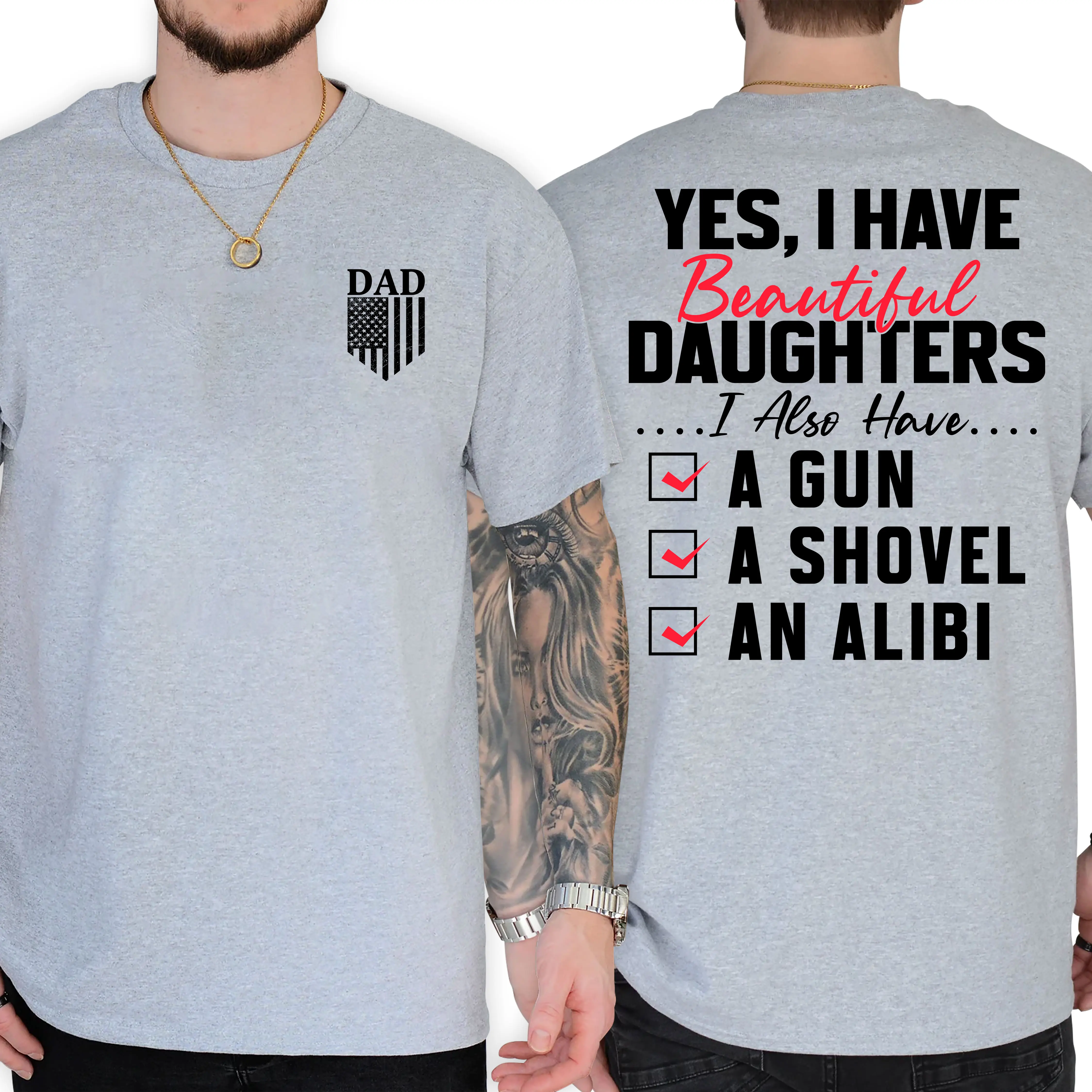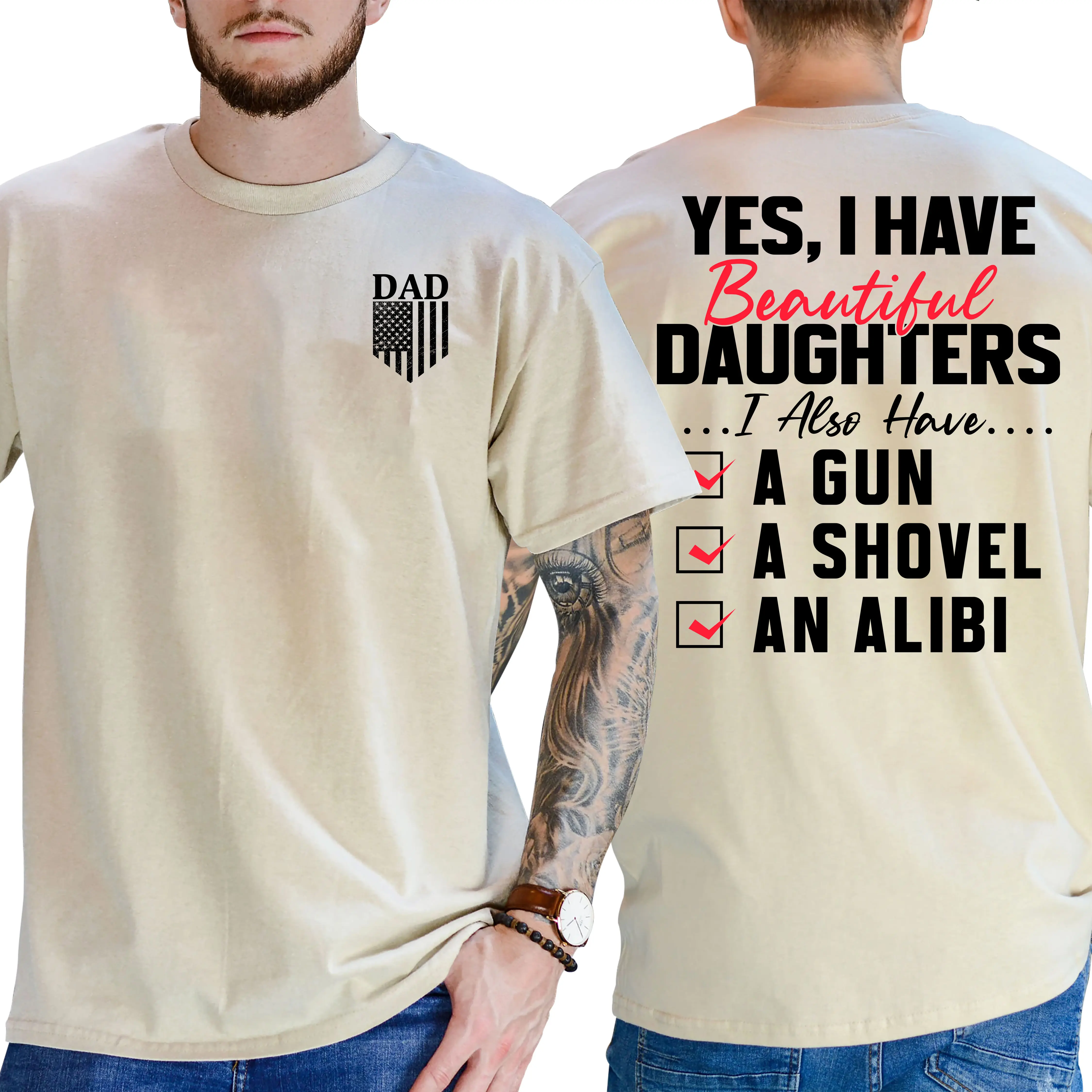 Yes I Do Have A Beautiful Daughter Gun Shovel Alibi T-Shirt, Short Sleeve Printed Graphic Shirt, Daily Casual Cotton Menswear