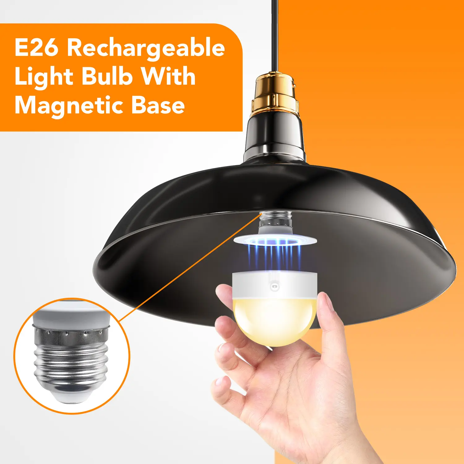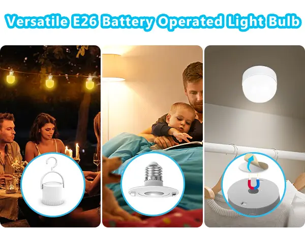[More Than Just an LED Bulb – Three Uses] – This rechargeable LED bulb comes with both an adhesive base and a hook base, making it versatile. It can be installed in any E26 lamp holder, cabinet, or wardrobe, used as a tent light for camping, fishing, hiking, or as a nightlight to help you sleep better.