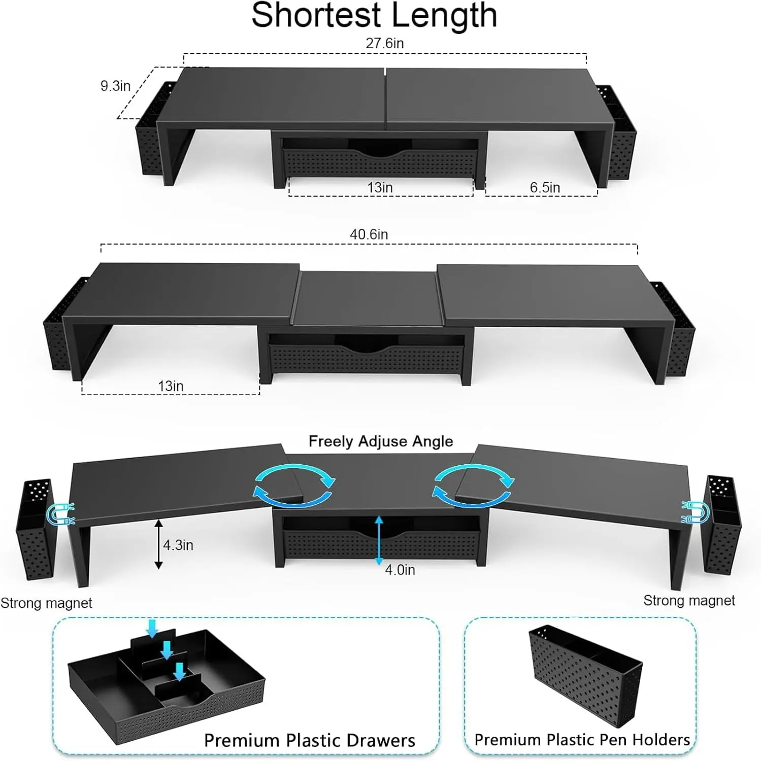 The dual monitor stand features two magnetic pen holders and a drawer, allowing you to easily organize your desk accessories and office supplies, keeping your workspace clear and tidy for easier access.
