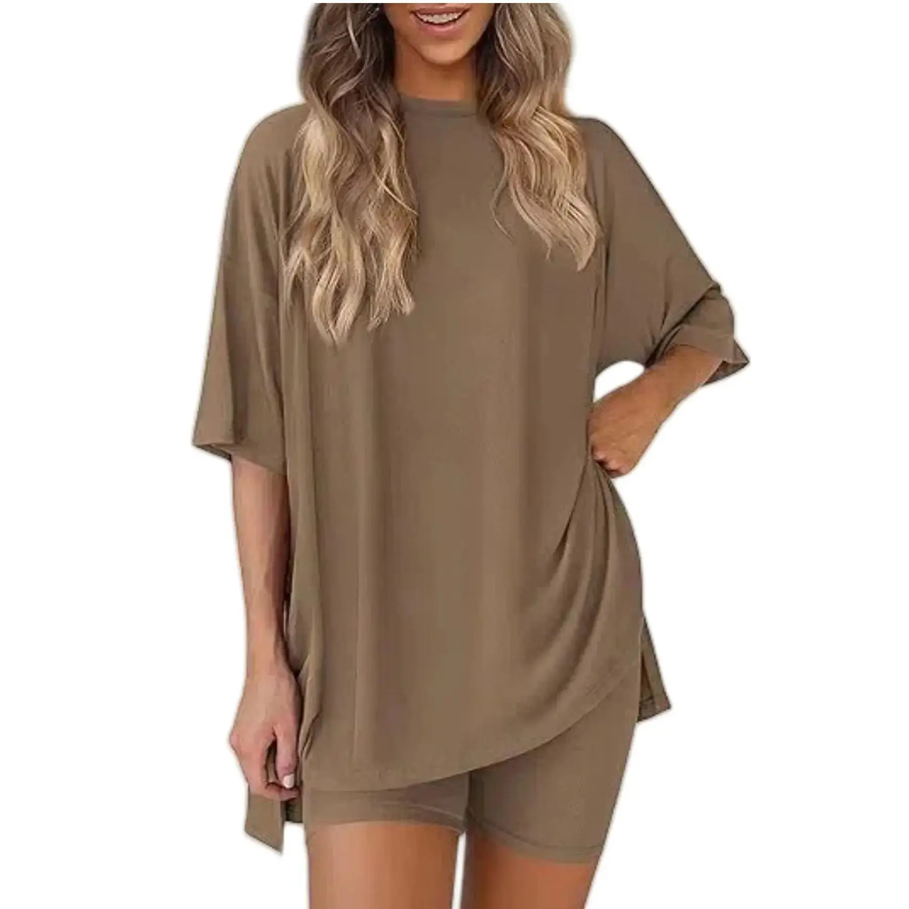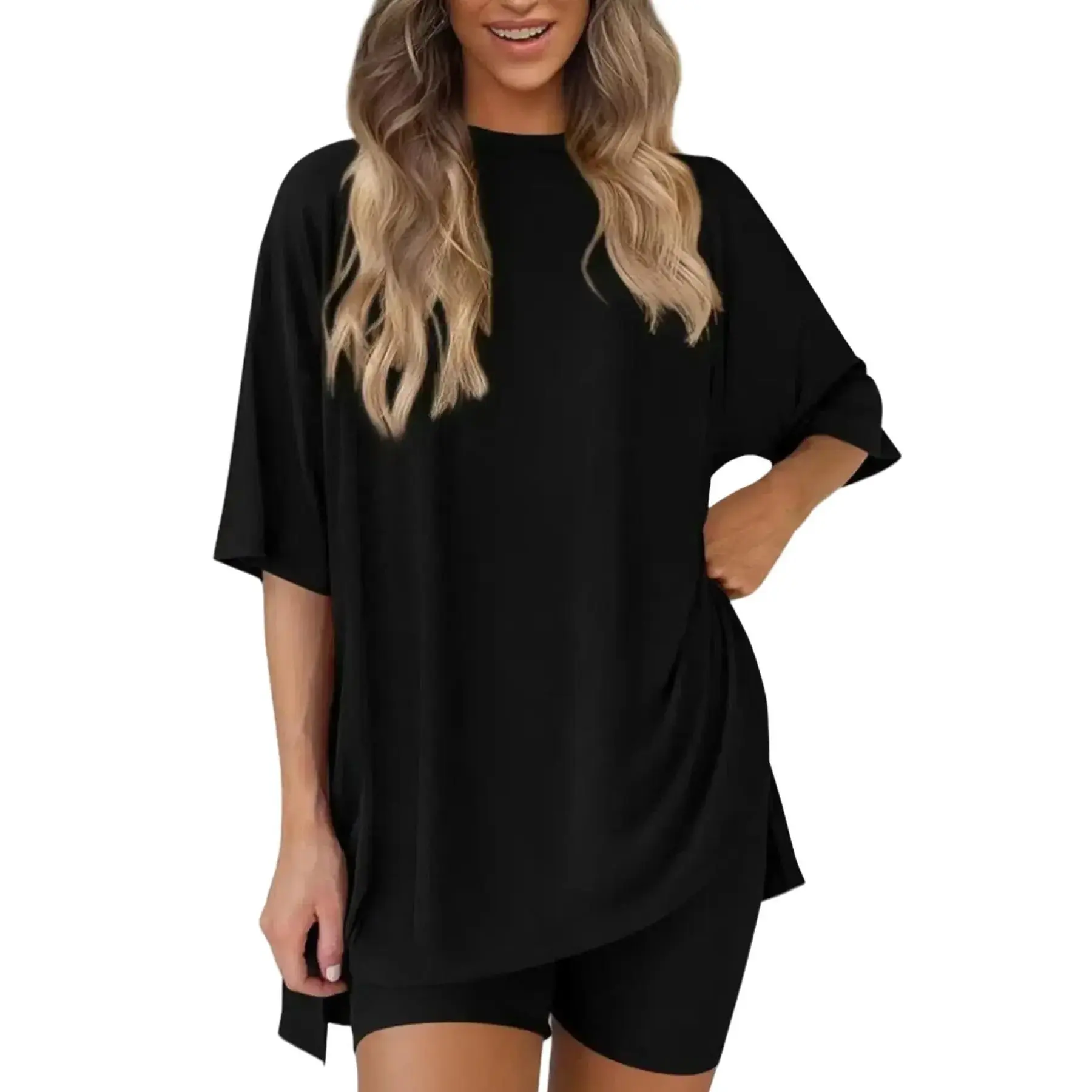Women's Solid Color T-Shirt and Fitted Shorts Knit Loungewear Set, Casual Comfortable Round Neck Sleepwear for Summer, with Pockets and Oversized Fit,Women's Affordable Pajamas, Clothing Set