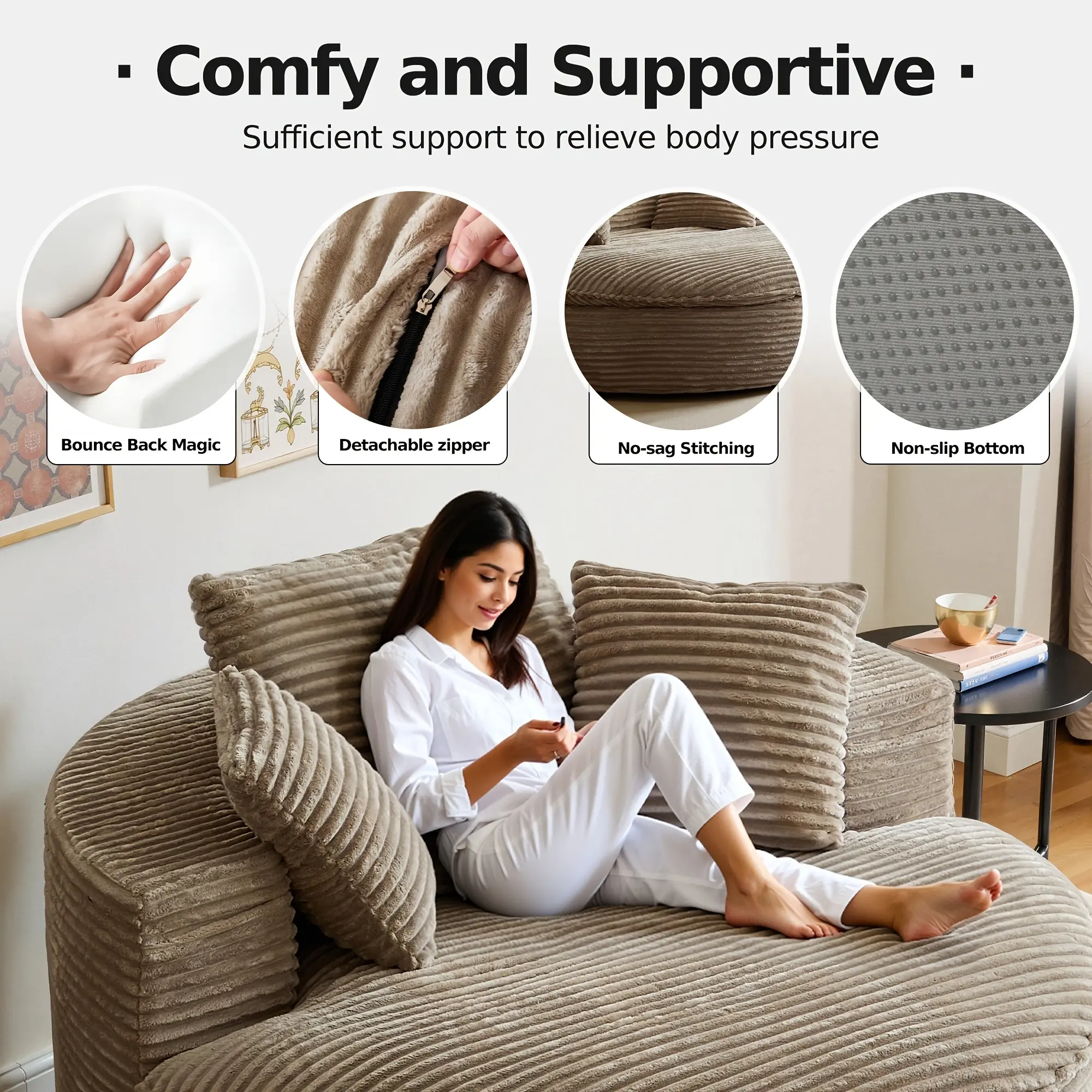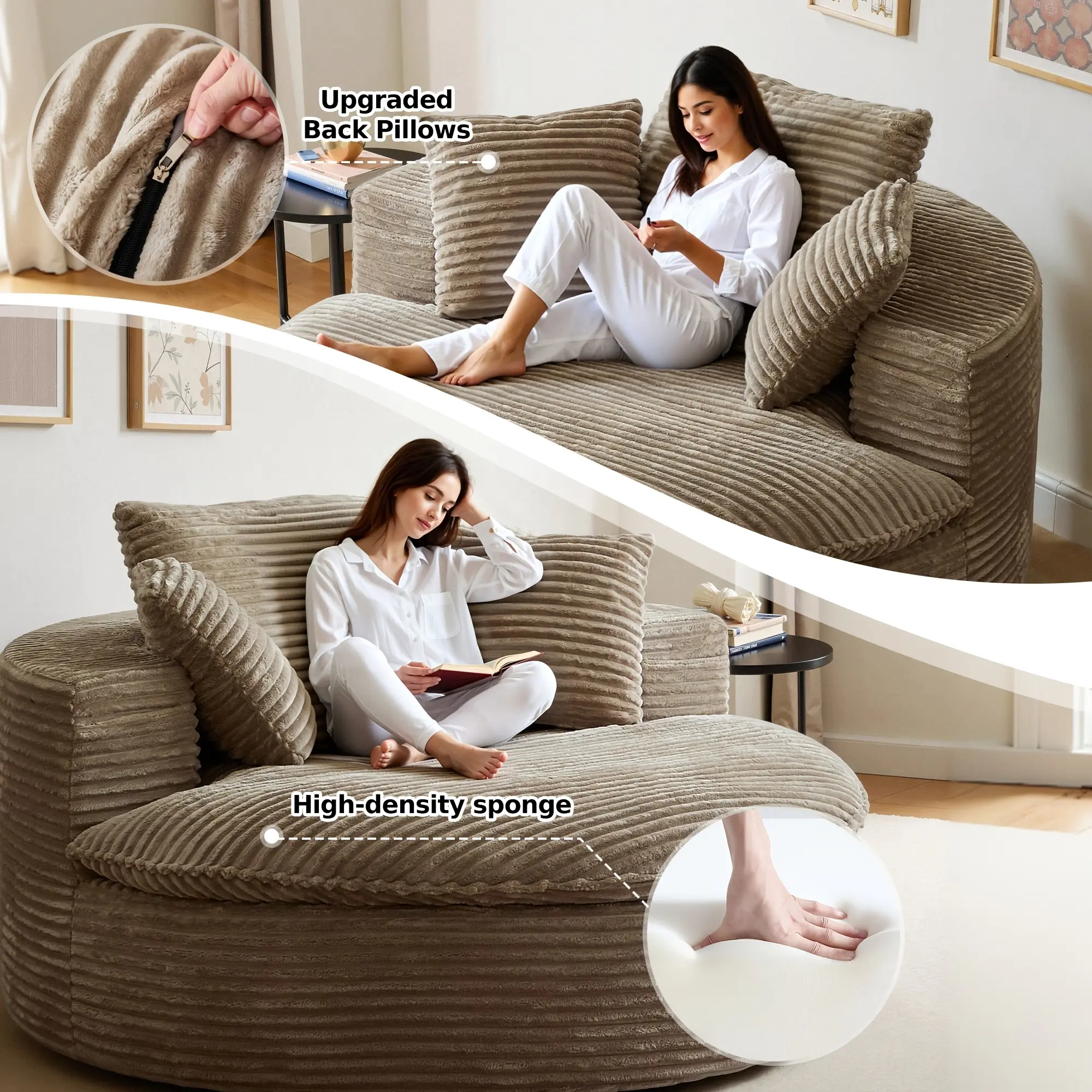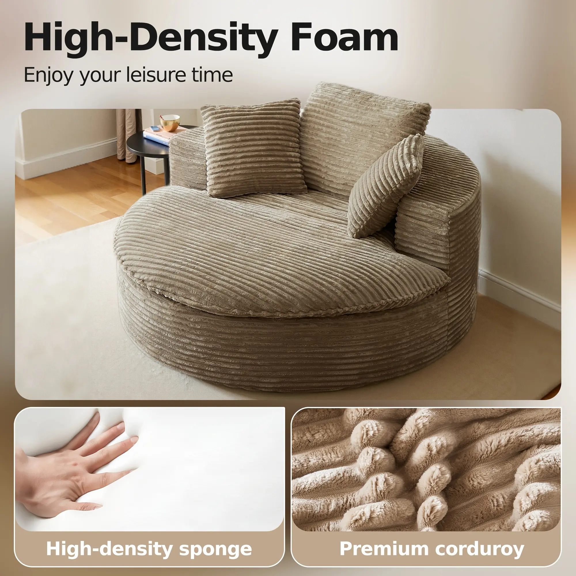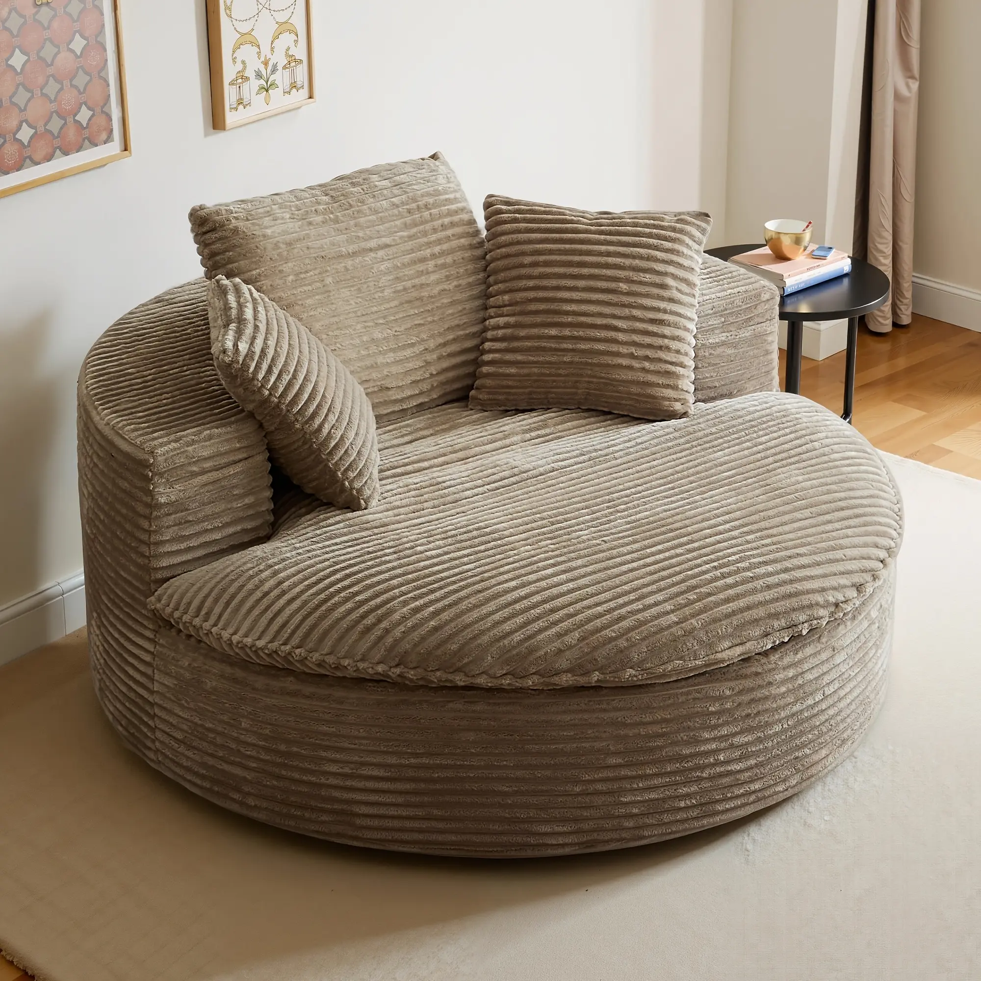 Given that this is a compressed product, it is packaged with an outer plastic film wrap.To prevent any potential scratches to the product enclosed within, please handle the film separation process with care.Modern Lounge ChairPerfect for your favorite leisure activities, this round chair provides exceptional comfort.Whether you're reading, binge-watching shows, or resting, the accent chair offers the ideal cozy spot.Place it in your living room, bedroom, or office to create your relaxation zone wherever you need itSoft yet DurableThe circle chair features premium corduroy upholstery that's incredibly soft to the touch.Its rich texture adds a touch of elegance to your living space and can withstand the wear of everyday use, ensuring it stays looking fresh and vibrant for a long timeDive into ComfortThis boneless chair, designed for ultimate relaxation, blends a double-layer high-density foam seat cushion to provide the combination of softness and support.Three back pillows made from the same material are also supplied for additional lumbar and back supportCompact Round DesignThe comfy chair features a thoughtfully crafted, rounded design that not only eliminates sharp corners but also optimizes the seating area for maximum comfort.With a generous seat space measuring 39" depth and 59" width, it provides ample room for relaxation and socializingConvenient Ready-to-UseThis floor chair is compressed in space-saving packaging, while requiring no assembly.Say goodbye to the hassle of the complicated assembly process!Just cut open the outer packaging and let it expand.It takes about 72 hours to return to its original shape, please be patientExpress delivery servicewe have chosen fedex to provide you with delivery services. Its efficient delivery time is widely recognized in the industry - your package can be delivered within 2 working days at the fastest, and under normal circumstances, it can also be safely delivered within 7 working days to quickly respond to your receiving needs.