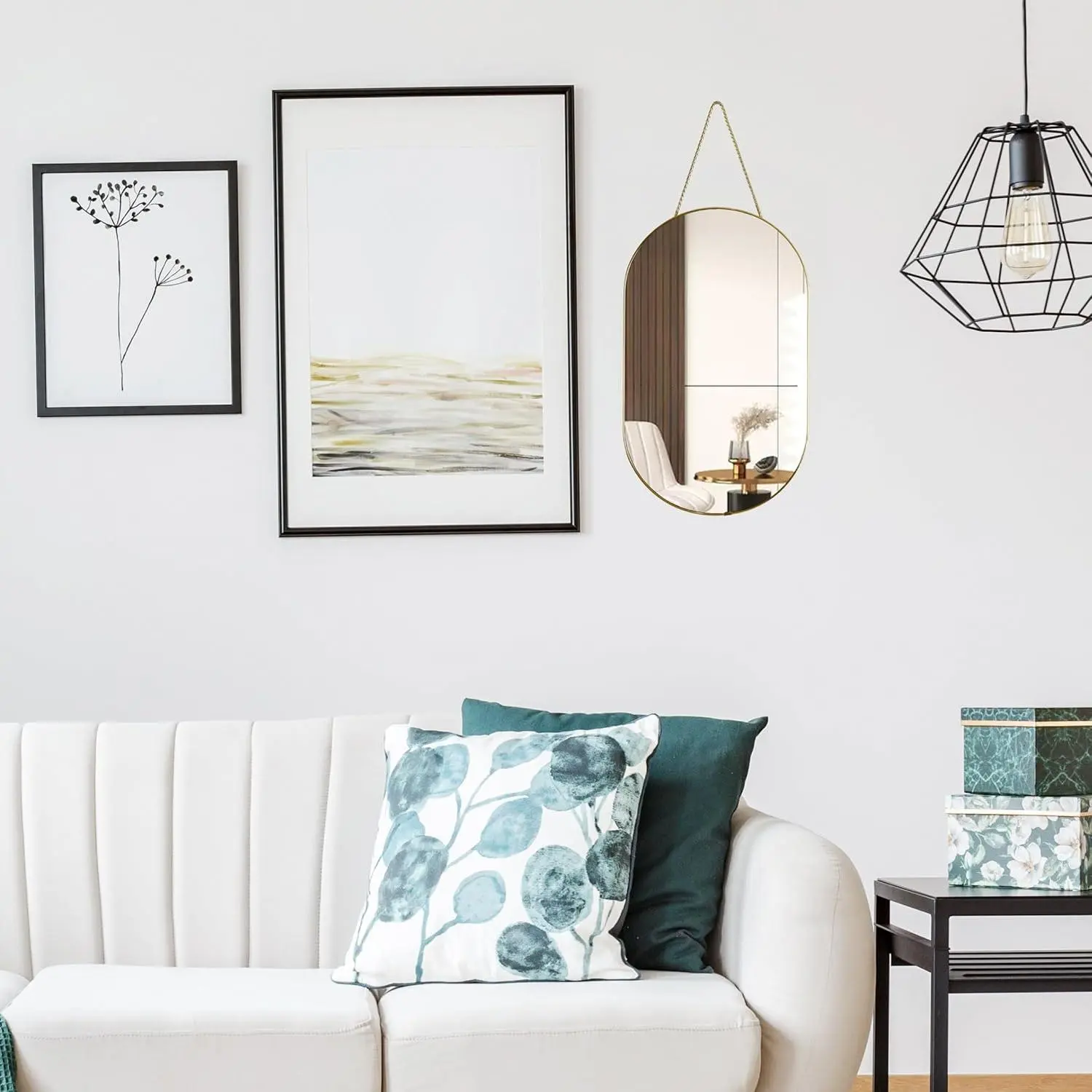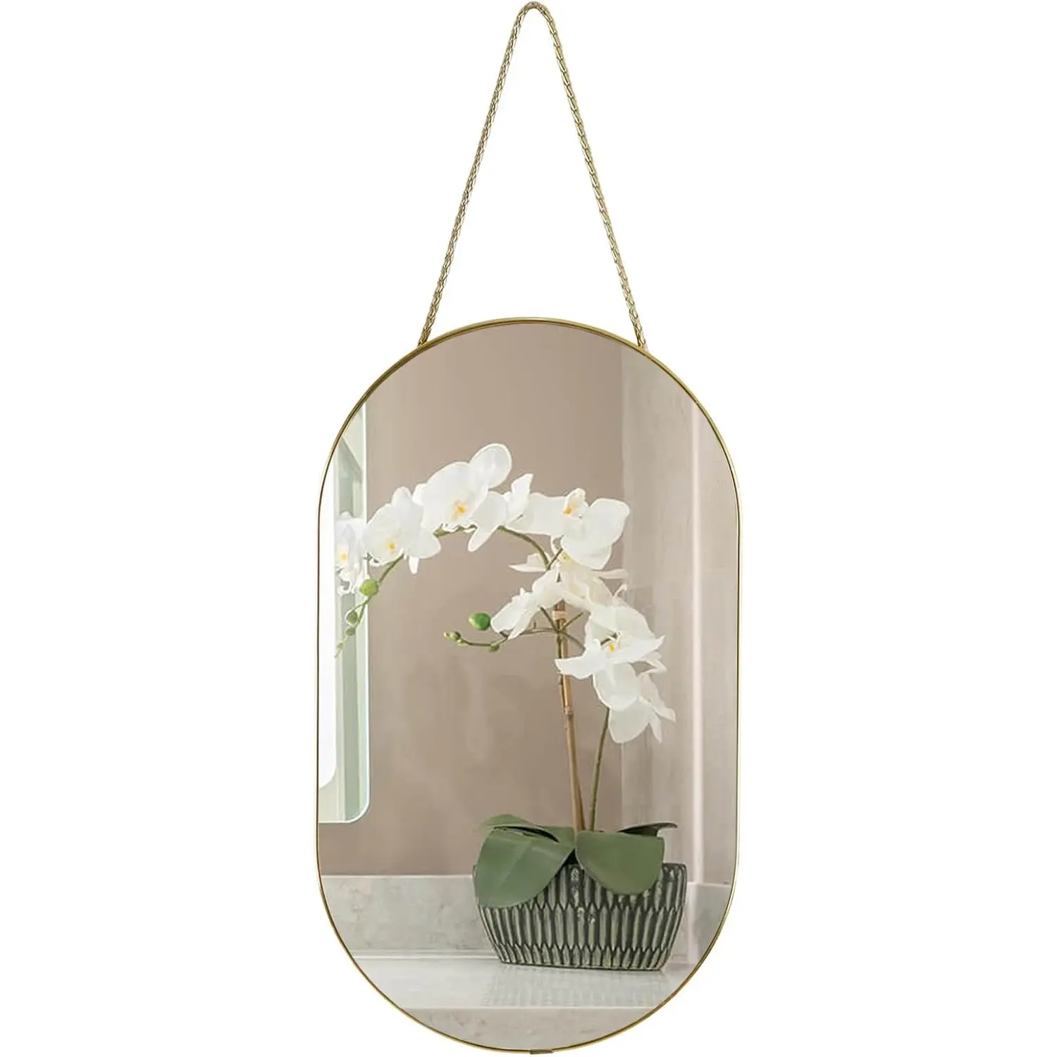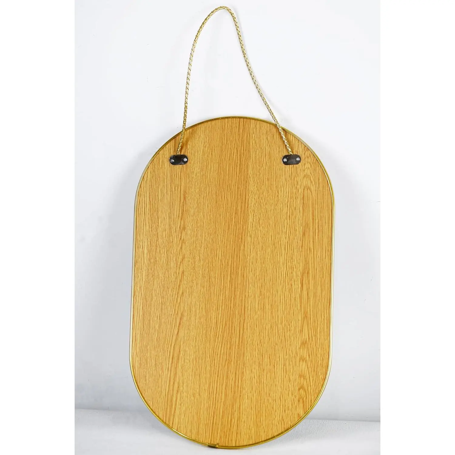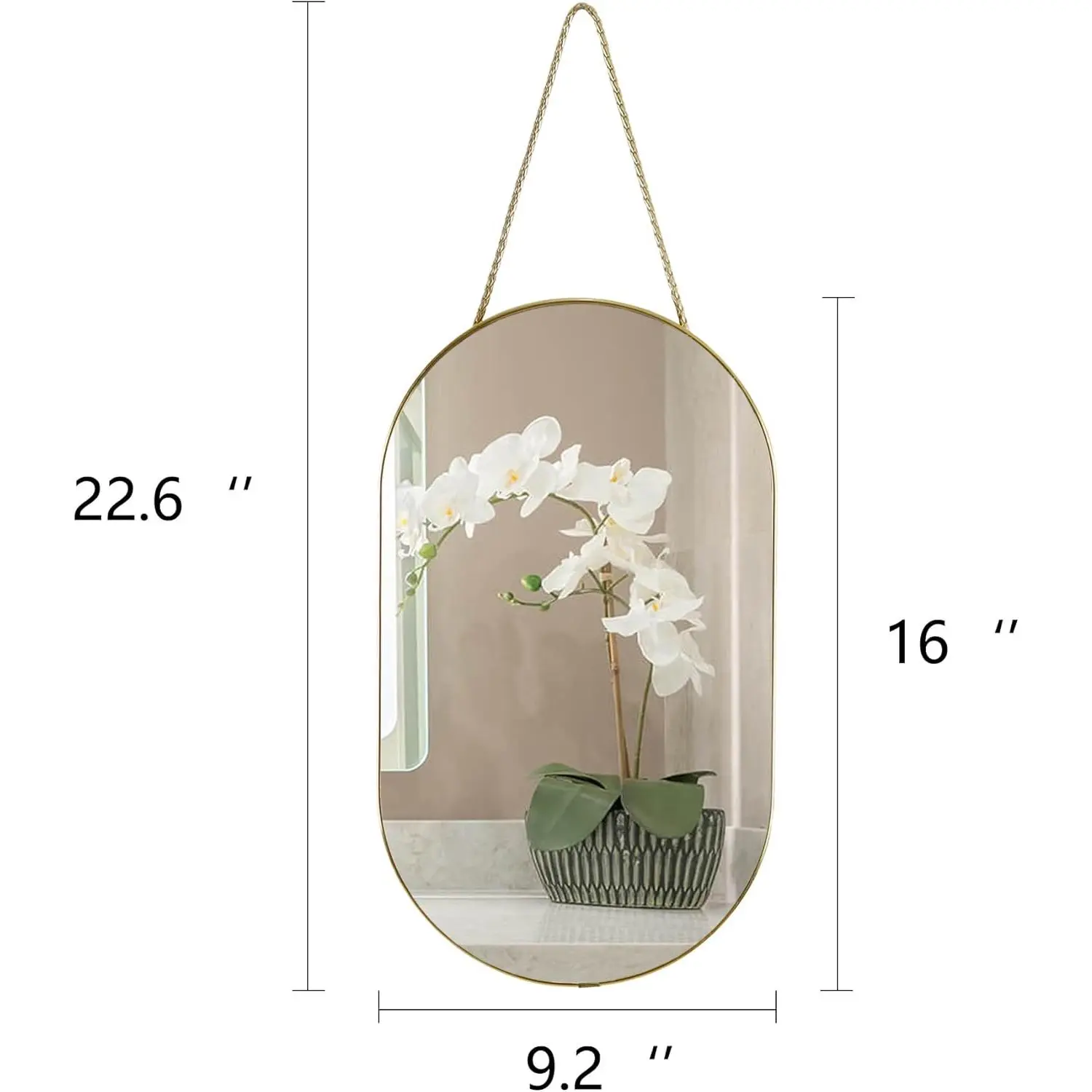 Gold 16x9.2 inch Oval Mirror: Gold PVC Plastic frame of wall mirror, simple and modern design, high-definition imaging without distortion, suitable for any room, bathroom, bedroom, living room, hallway, entrance, etc.Sturdy and lightweight mirror: 9mm MDF backing for sturdiness and durability1.1mm ultra-thin mirrorultra-thin mirrors can have slight image distortion at long distances.Dimensions and materials:PVC frame,MDF backplane and glass mirror.16x9.2 inch, weight 1.57 pounds, very light.Easy to Install:Comes with a lanyard made of PU, sturdy and durable.Screws not includedIf you have any questions about the mirror, please contact usIf the mirror is broken, please contact me for a refund