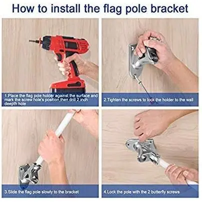 The flag pole holder for outside house is made of 304 stainless steel and perfect craftsmanship, make your flag pole could stand up still in strong windy area.And the surface is colored by electrophoresis,which is not easy to drop ,resistant to seawater corrosion, durable & Never RustThis flag holder fits most 1" flag poles or less, with 3 adjustable stainless steel lock nut for securing the pole, it won’ t run out.You can fix the flagpole at a right angle to your house at 90 degrees, or upward at a 45 degree angleThe flag bracket comes with all hardware screws, and a wood drill bit for your convenience.If you install it on concrete or metal surface, you need to drill a 5/16 " (8mm) hole with a masonry bit(not included)The flag pole mount including all of the screws are made of stainless steel.This flag pole kit can be installed to your walls, yard, roof, or even your truck, boatThis flag pole bracket is sturdy,durable, waterproof, anti-ice, anti-rust and anti-oxidation, which is not possible with aluminum products.This product guarantees a service life of more than 30 years