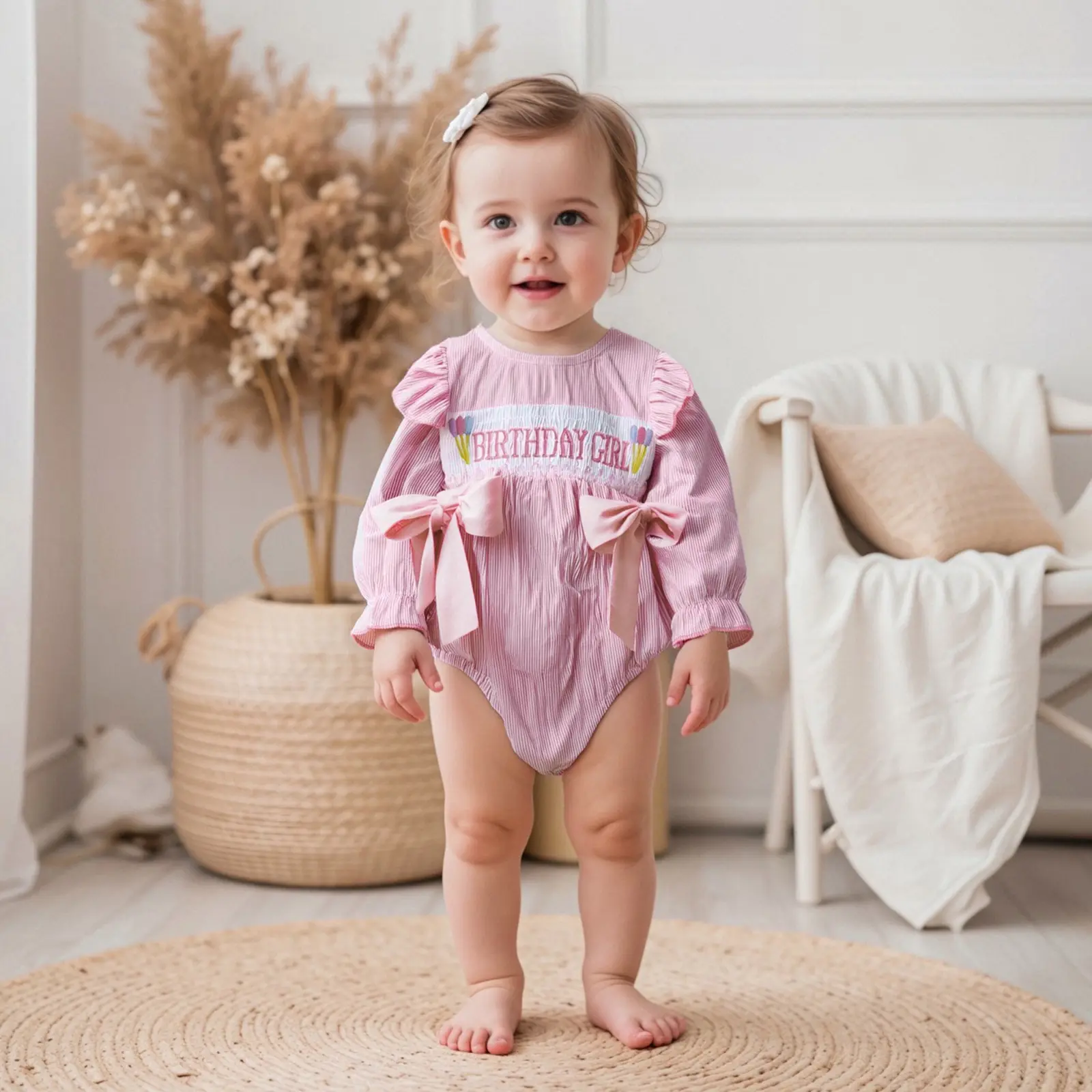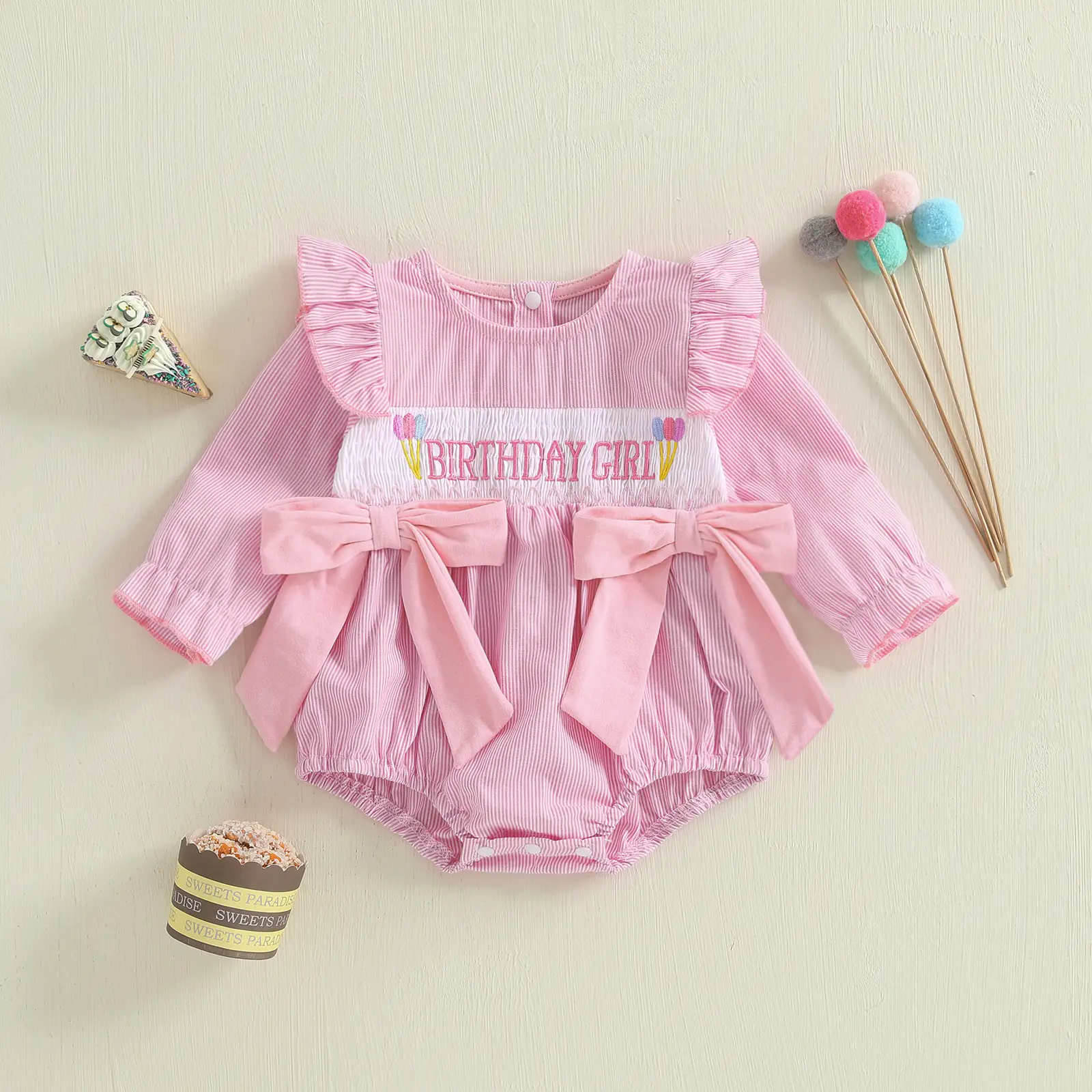 Baby Girl Birthday Day Romper Long Sleeve O Neck Letter Embroidery Striped Jumpsuit