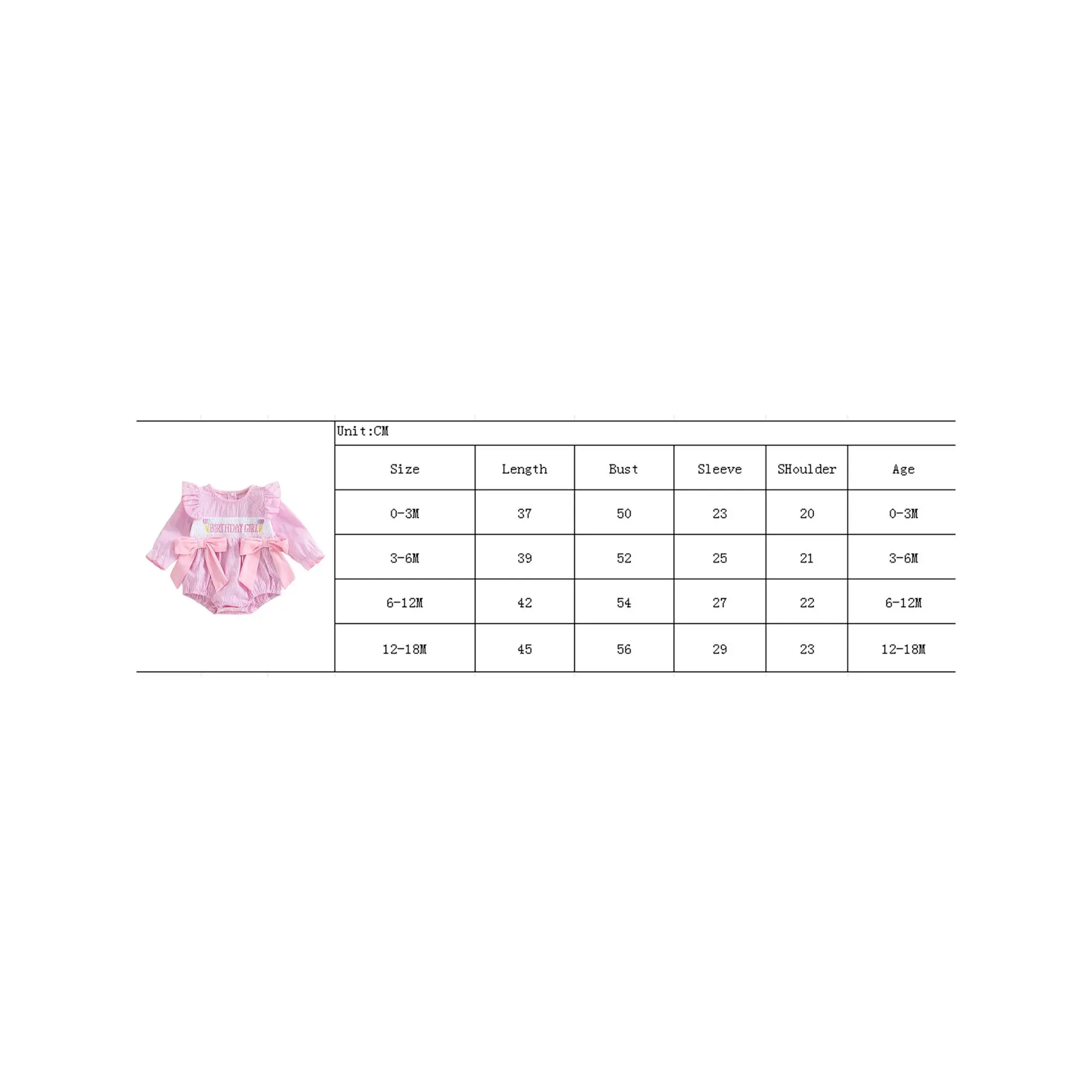 0-3M Length: 14.57 Bust: 19.68 Sleeve: 9.06 Shoulder: 7.87 Advised Age: 0-3 Months
