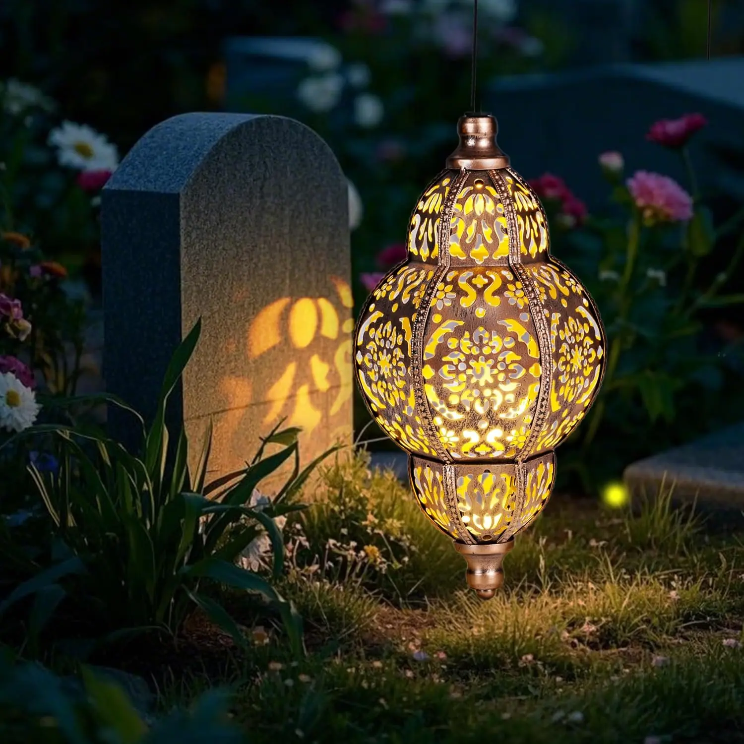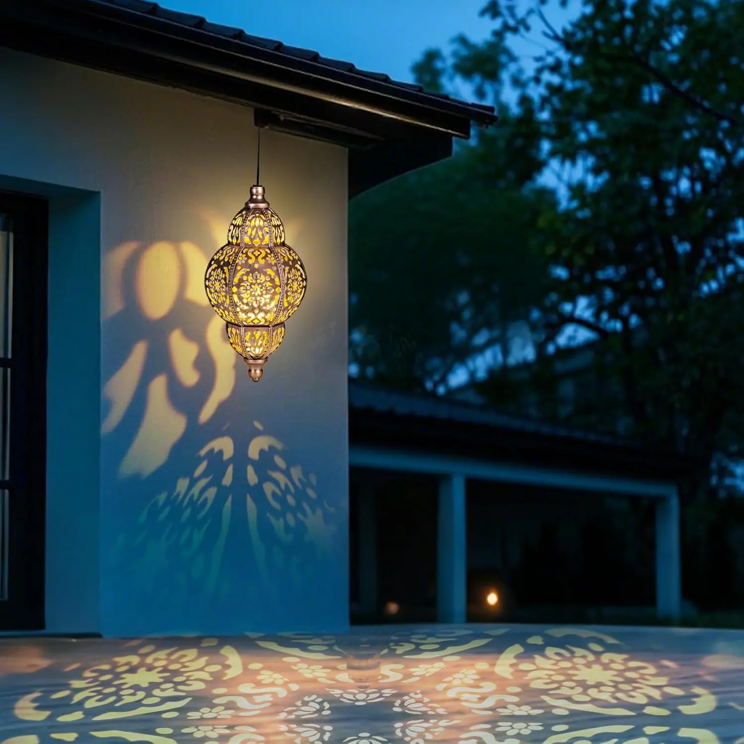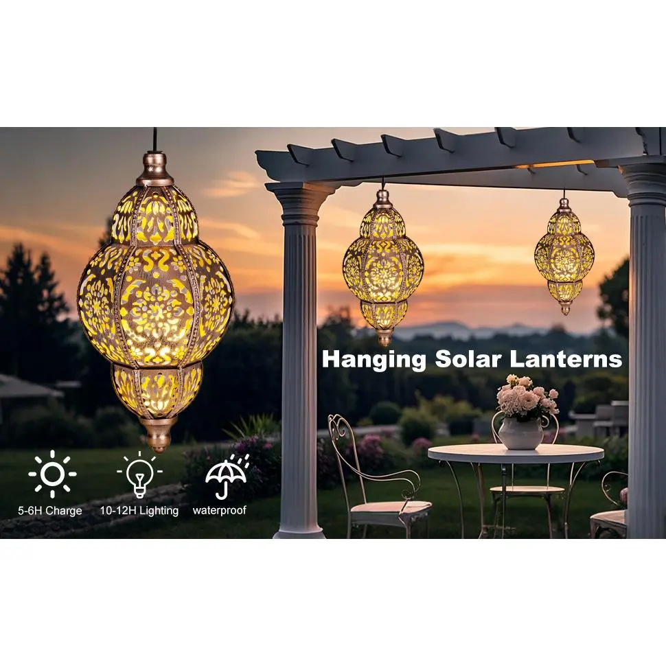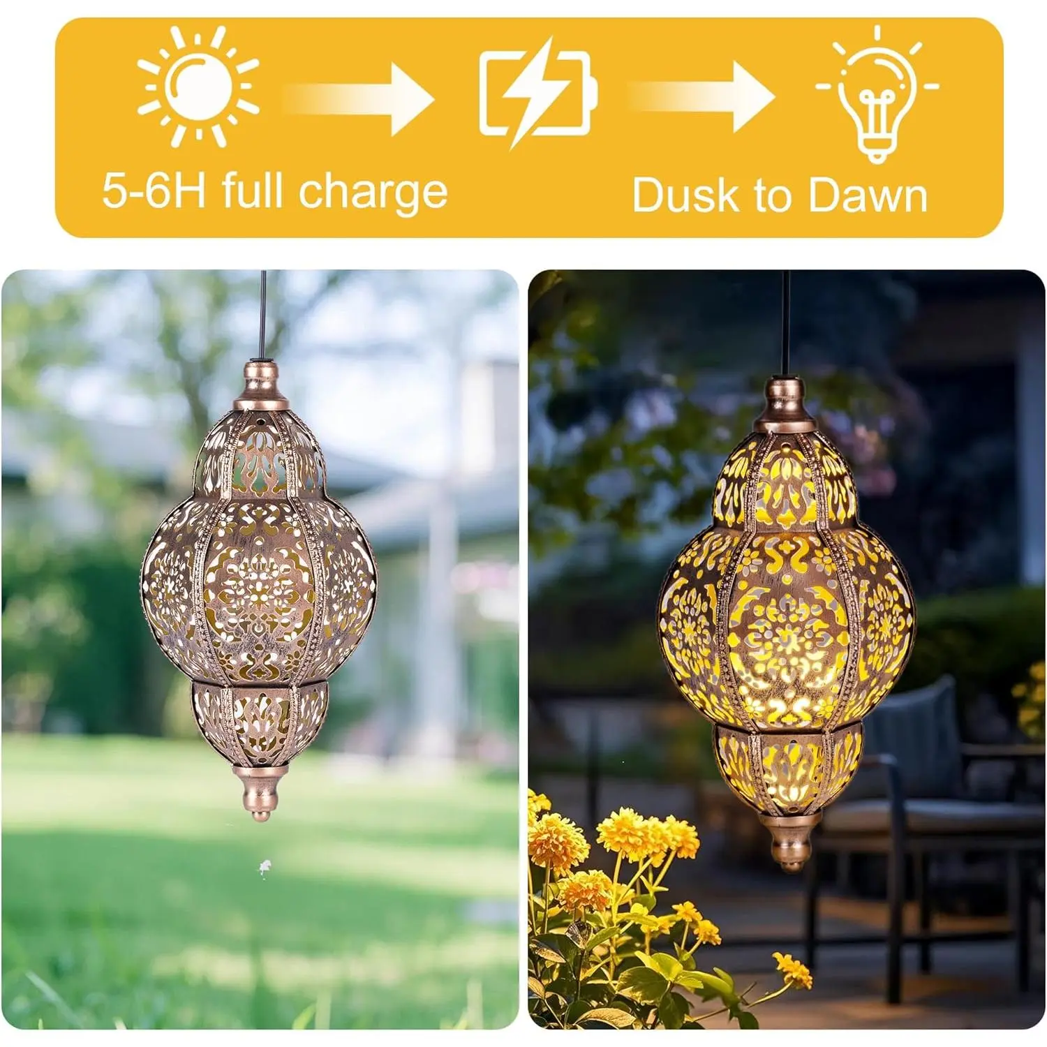 Elegant Moroccan Lantern: Add a warm, inviting glow to your outdoor space with this gold-copper solar lantern outdoor.The intricate lotus flower cutouts create stunning light patterns, perfect for your garden, patio, or porch.Fast Charging, Long-Lasting Solar Power: hanging solar lanterns is equipped with high-efficiency solar panels, this lantern fully charges in just 6 hours and provides over 8 hours of bright, consistent illumination-no cords, no electric bill.Built Tough for All Weather: Made of durable metal and IP65 waterproof, this solar chandelier stands up to rain, snow, and heat.Designed for year-round use, it brings reliable beauty in every season.Perfect for Decorating & Gifting: Hang it from trees, hooks, or place it along walkways-this outdoor solar lantern fits anywhere.Also makes a great gift for housewarmings, weddings, Christmas, or birthdays.Auto-On & Worry-Free Support: Switch solar lights to "ON" and let it light up at dusk automatically. We’re here to help with fast, friendly support-your satisfaction is our top priority.