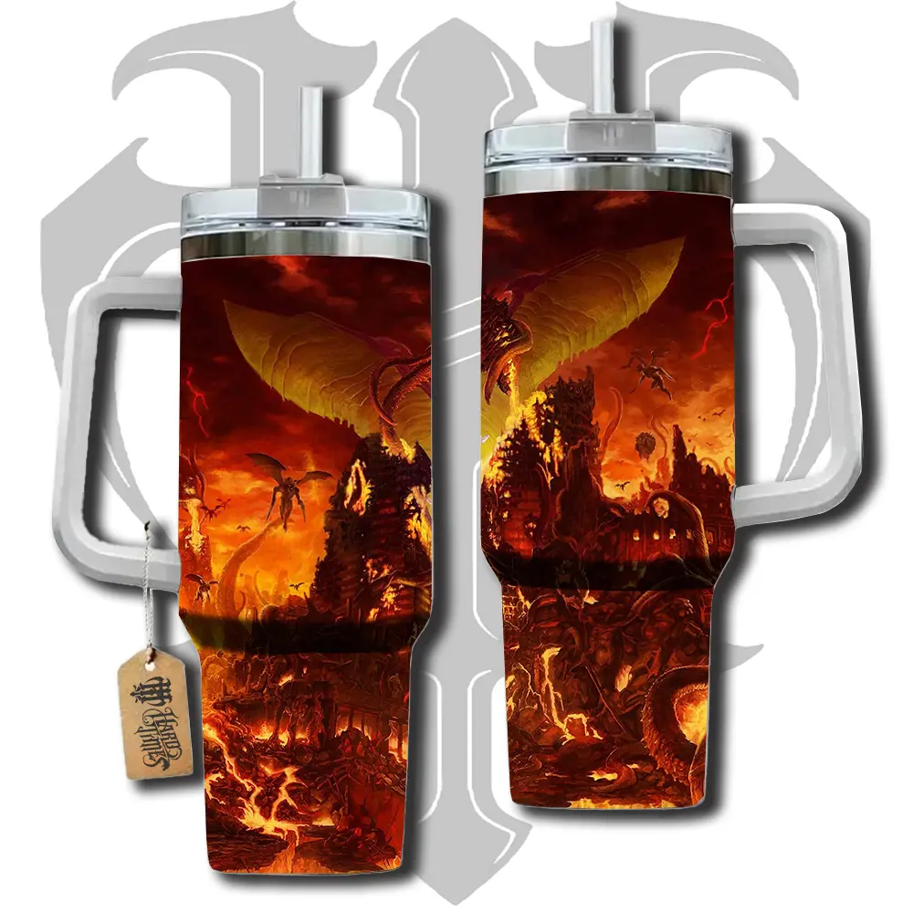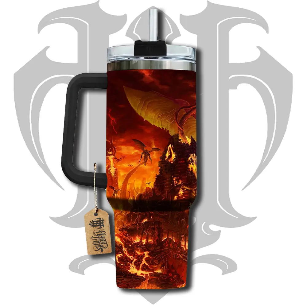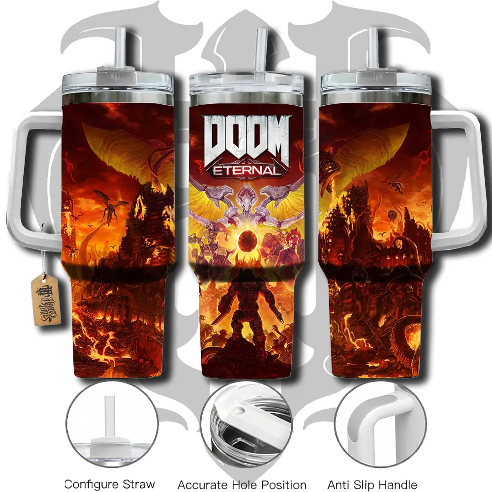 HardTimesMerch - Doom Eternal 40oz Handle Tumbler Stainless Steel Travel Mug, Anime Inspired Vacuum Insulated Cup, Large Iced Coffee Tumbler, Manga Fighter Drinkware, Otaku Gift for Him Her