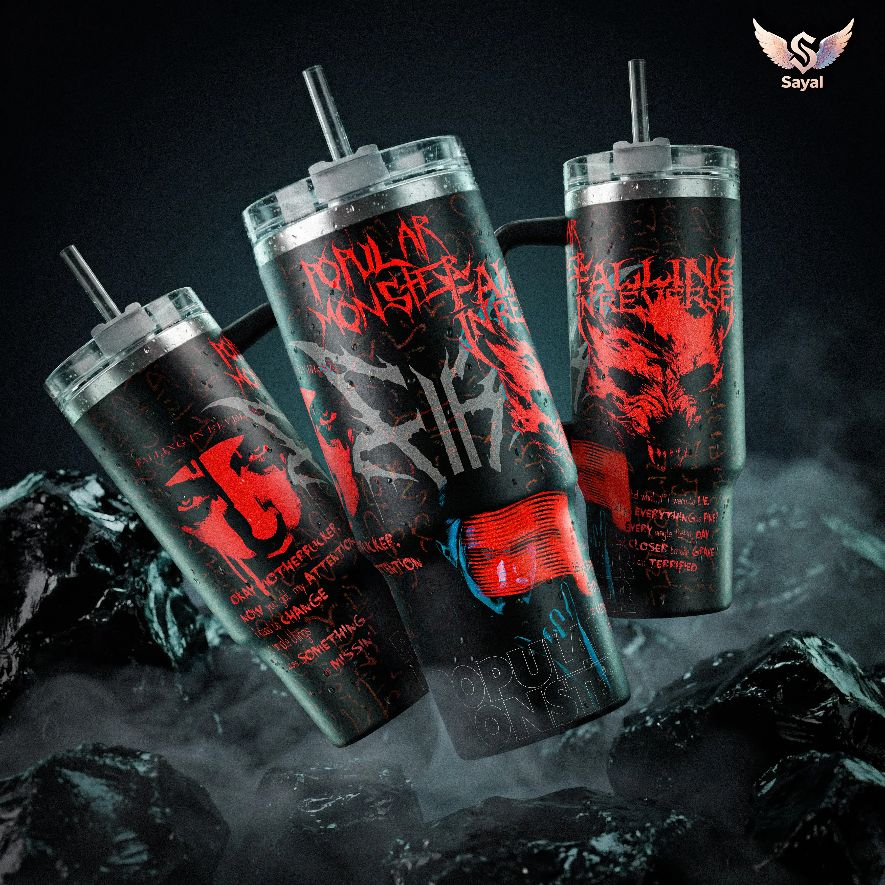 Popular Monster Album Falling in Reverse 40 oz Vacuum Insulated Tumbler with Handle Straw Red Black Horror Face Graphic Keeps Drinks Hot/Cold 12H+ 18/8 Stainless Steel Travel Mug for Rock Fans Metalheads Dark Aesthetic Merch Gift