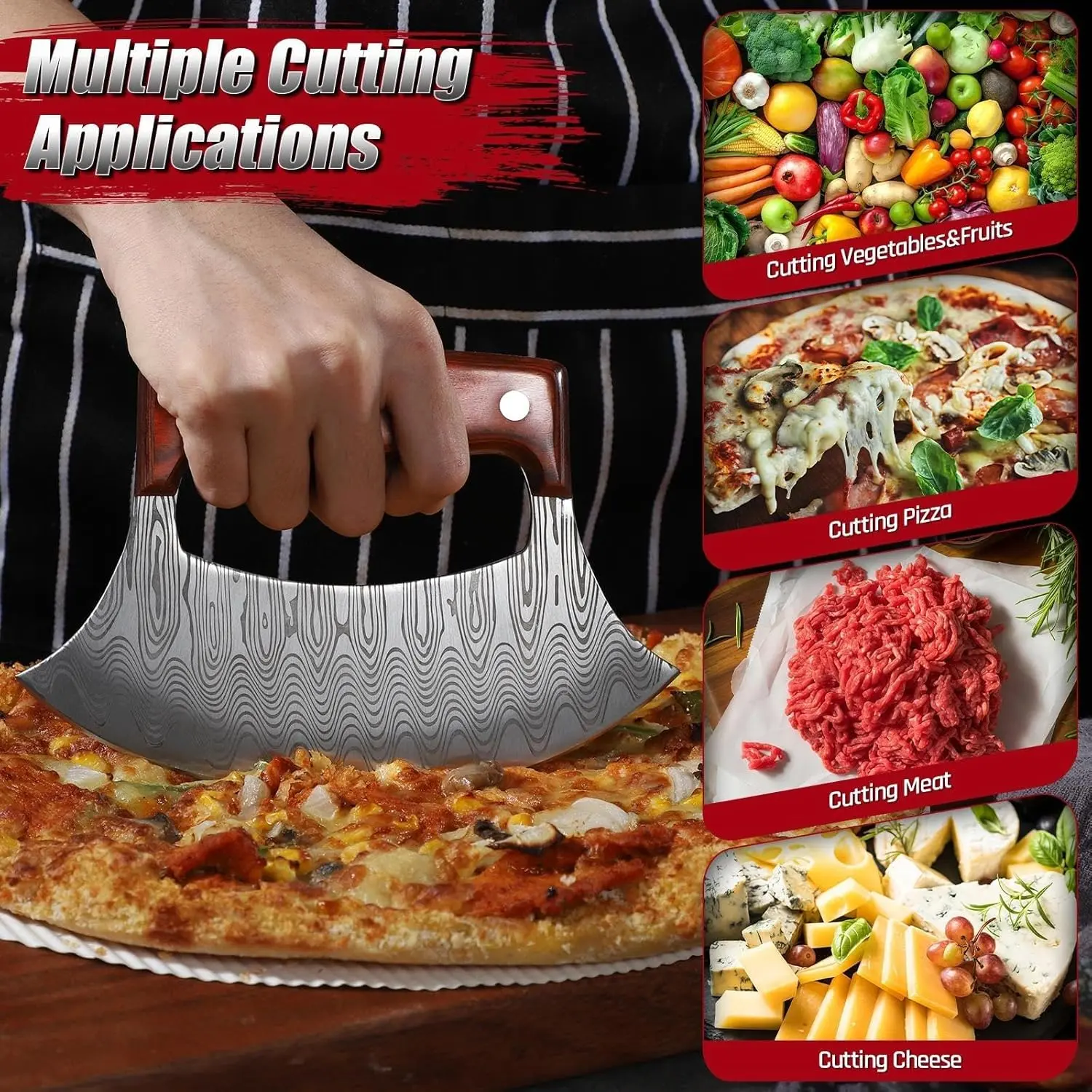·SHARP SEMI-CIRCULAR BLADE - Made of high-carbon stainless steel for durability and rust resistance, its razor-sharp V-edge and semi-circular design deliver smooth, effortless cuts on pizza, fruits, and vegetables. The polished laser water pattern ensures easy cleaning and an elegant look.