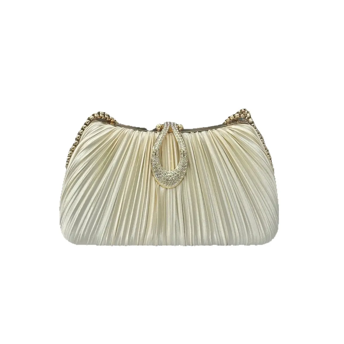 The clutch boasts a timeless style with its pleated texture and elegant embellishments. The central decorative element adds a luxurious flair. It's a perfect match for formal events, enhancing your outfit with its sophisticated design. This clutch is a must-have for those who appreciate fashion and elegance in their accessories.