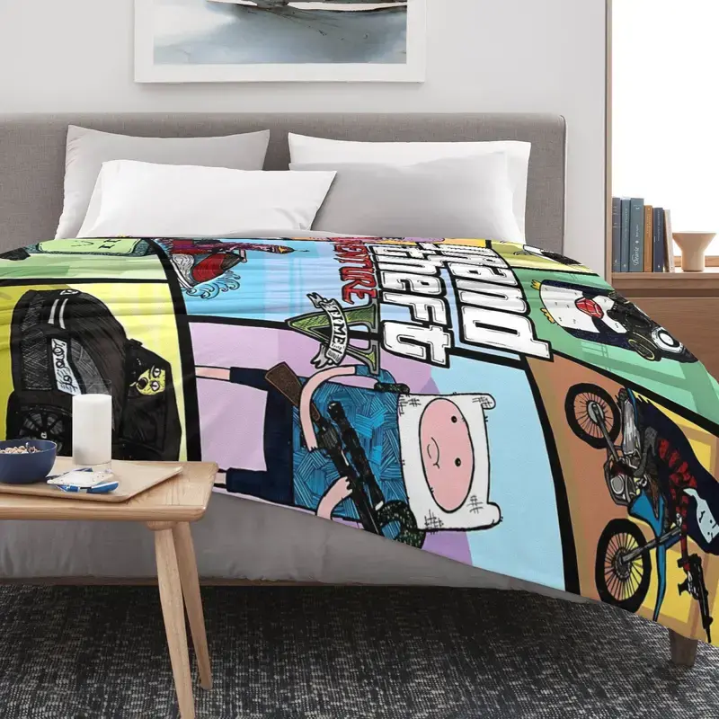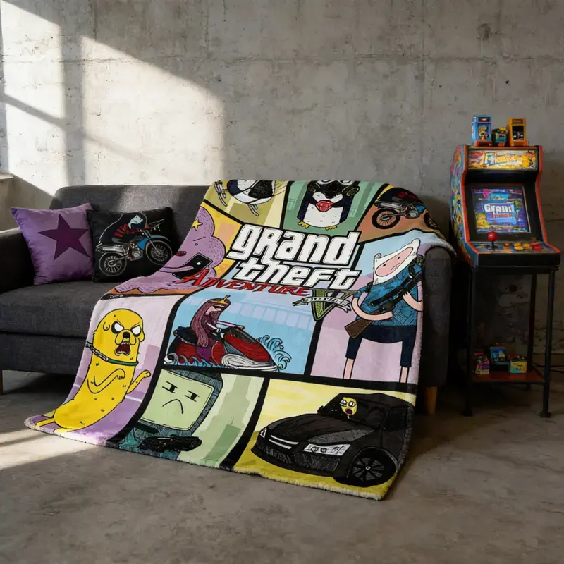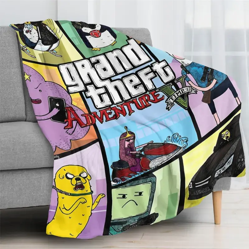 Featuring a bold GTA-inspired grid design blending Adventure Time characters like Finn and Jake with iconic game elements, this cartoon gaming blanket is a must-have for fans of both the show and video games.