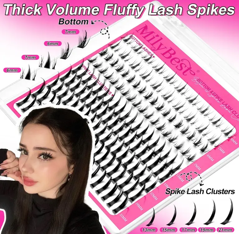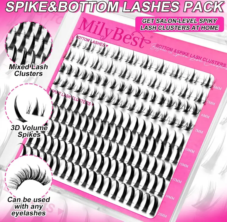 Spiky Lash Clusters with Bottom Lashes: Create dramatic doll-like eyes with our bottom lash clusters. These two spiky bottom lashes (6mm-7mm) naturally fan outward to make eyes appear larger and brighter, with mixed length lash spikes (13mm, 15mm, 17mm, 19mm, 21mm) perfect for balancing any lash style or wearing alone for subtle enhancement