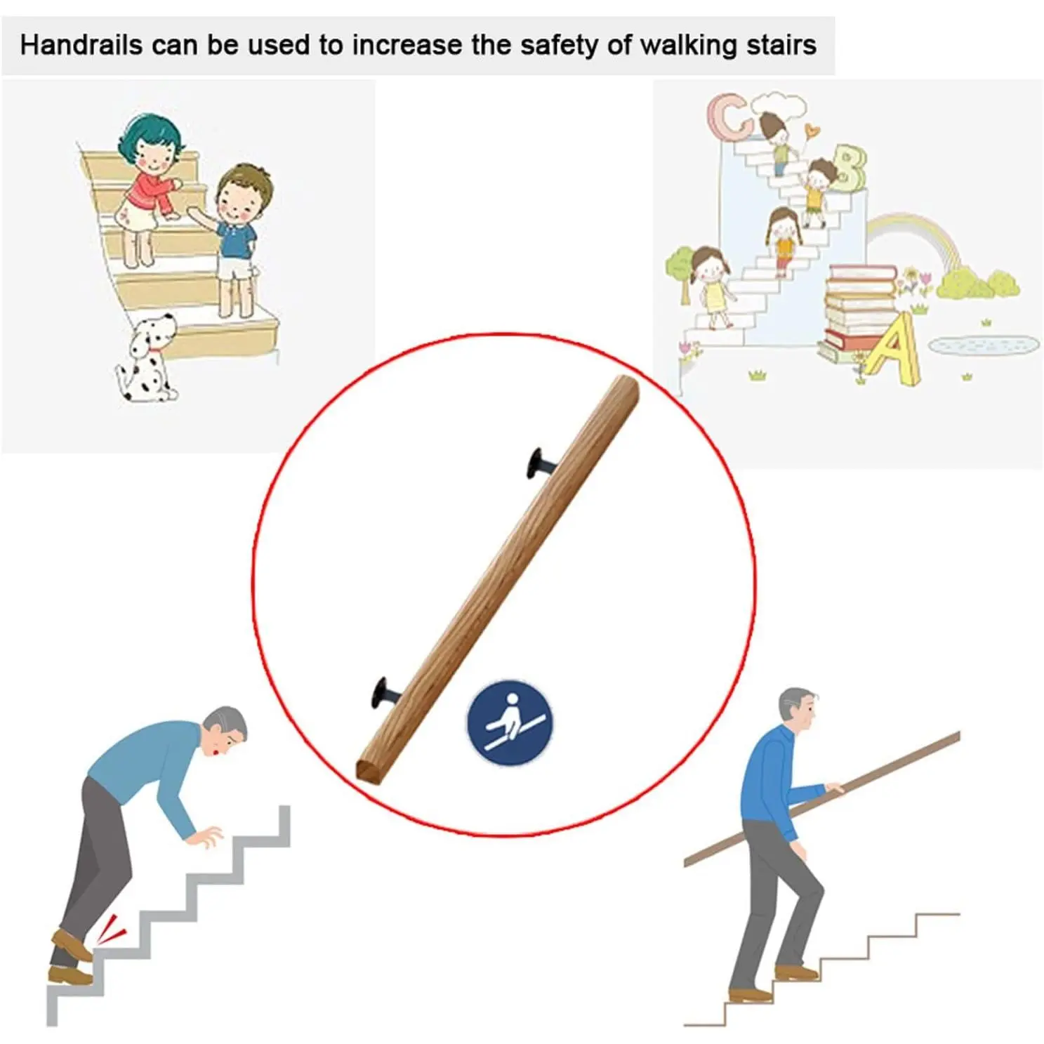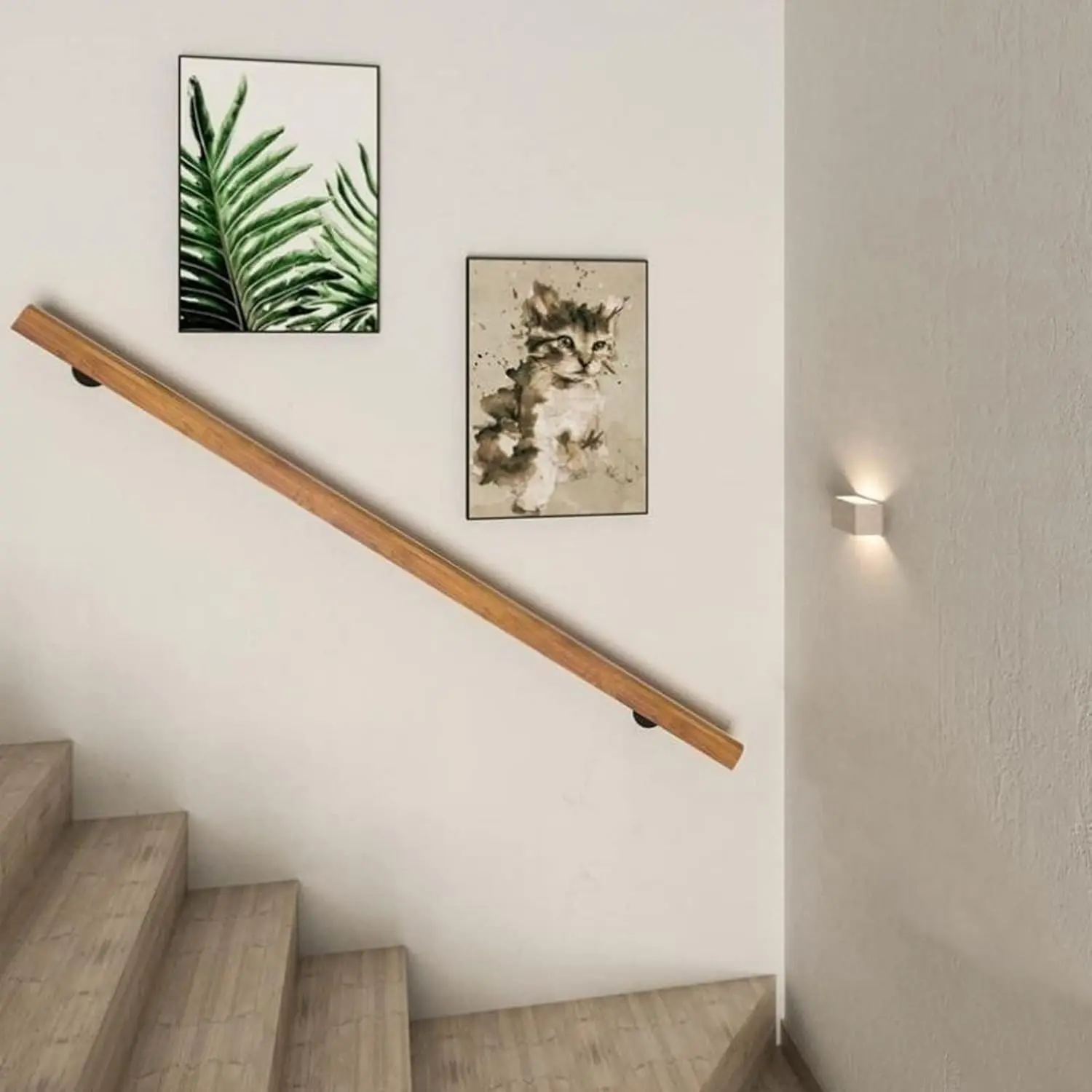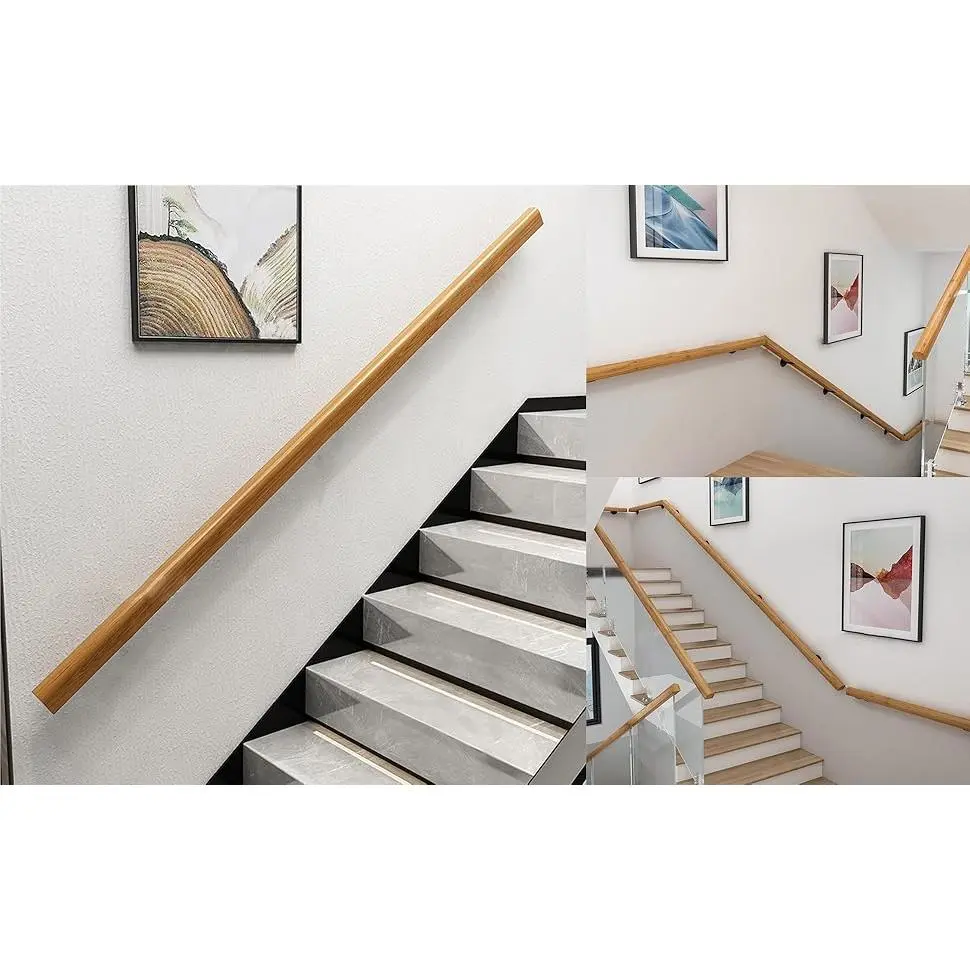 [Sturdy and beautiful]Pine wood.The wooden edge of the stair handrail is treated with rounded corners, with natural color, clear texture and smooth surface, which is easy to grasp and prevent friction between old and young.Exquisite workmanship, strong, wear-resistant and durable.[Handrail Size]The handrail is 1-9 ft. 1-8ft: a single piece, 9ft: in sections.Diameter: 5cm/1.9in, distance from wall: 10cm/3.9in.[Handrail Accessories]Wall mounted stair railing with all mounting hardware and can withstand up to 550 lbs of pull.1-5 ft have two black brackets.There are 3 black brackets for 6-8ft, and 4 black brackets for 9ft.[Easy to Install]You need manual drilling and screws to fix the stainless steel bracket to the wall.The black stand can have a position of your DIY choice to meet your daily needs.[Application scenario]When entering and leaving the house, especially when carrying groceries, packages, and garbage, the railing can provide stable and reliable support.Can be used in dry or wet environments such as stairs, bathrooms, showers, corridors, villas, attics, bars, apartments, hotels, etc.