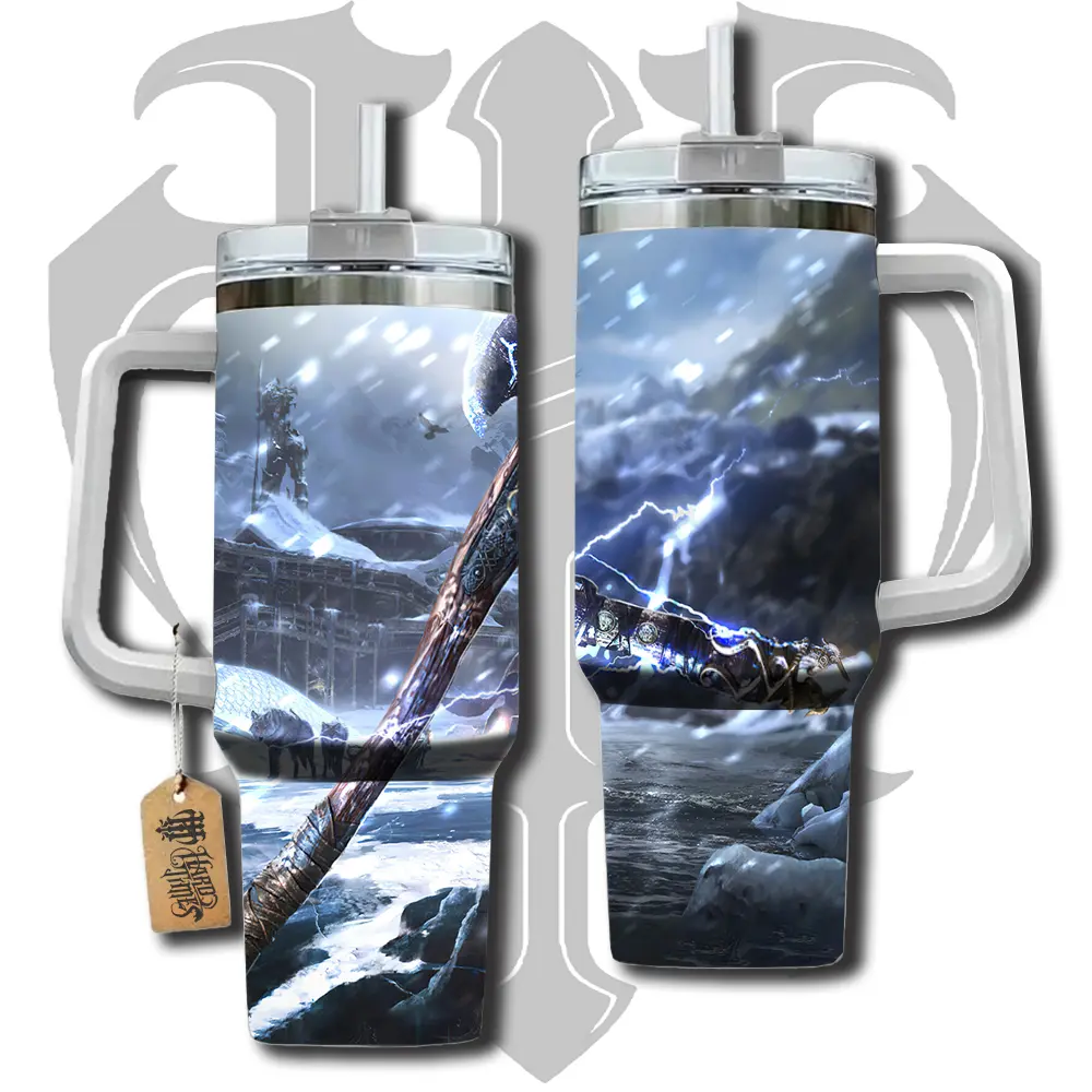 HardTimesMerch - God Of War Ragnarok 40oz Handle Tumbler Stainless Steel Travel Mug, Anime Inspired Vacuum Insulated Cup, Large Iced Coffee Tumbler, Manga Fighter Drinkware, Otaku Gift for Him Her