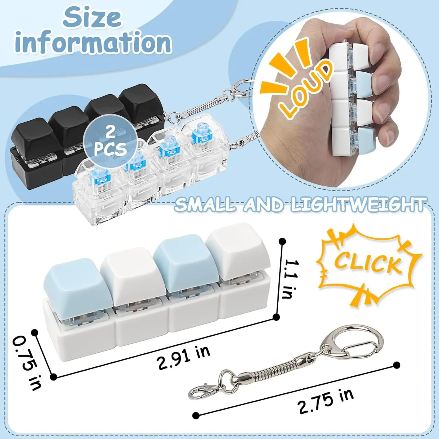 ·Size and Material: The size of this cute straight row key fidget toy is 1.1 x 2.91 inches/ 2.8 x 7.4 cm. It is mainly made of high quality plastic and zinc alloy, sturdy and smooth, not easy to fade or deform, can be used for a long time. And the cap and key chain of this Finger Clicker can be taken off or installed, you can DIY as you like