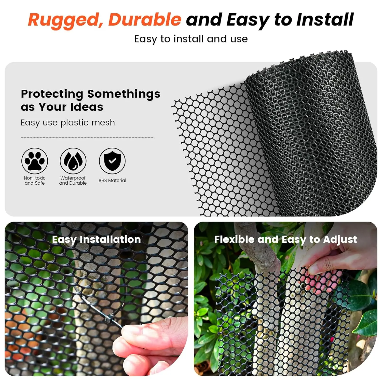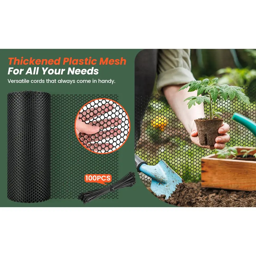 Product Dimension: This plastic bird netting comes in a standard size of 16 inches wide x 50 feet long and is equipped with 100 pcs zip ties (in the middle of netting), providing ample coverage suitable for a variety of settings, including large gardens, farms, and orchards.This standard-size design meets the needs of most users while being easy to install, ensuring practicality and convenience.Durable PE Plastic: Made from high-strength PE plastic, this plastic netting mesh is solid and weather-resistant.Unlike plastic-coated wire, it's a solid metal-free mesh that can withstand harsh weather.Good for flexible applications.Reusable: The floral chicken wire is bendablelightweight yet heavy duty.It won't tear easily, rust or rot like metal or wood, doesn't pester, and is reusable for longer protection.DIY Friendly: Easy to cut and install with standard tools and zip ties, no professional skills required.You can effortlessly DIY a pet fence, a deer fence netting, a plant climbing frame, a boundary net for a small sports field, or even imaginative thoughts like outdoor curtains or art installations, making your space truly one-of-a-kind.Versatile Function: Our plastic mesh fence is perfect for fencing poultry, defining breeding areas, or protecting crops. Its sturdy build creates secure enclosures for small livestock and easily divides farm or garden spaces. It also acts as a reliable barrier to defend plants from birds, ensuring a thriving harvest.