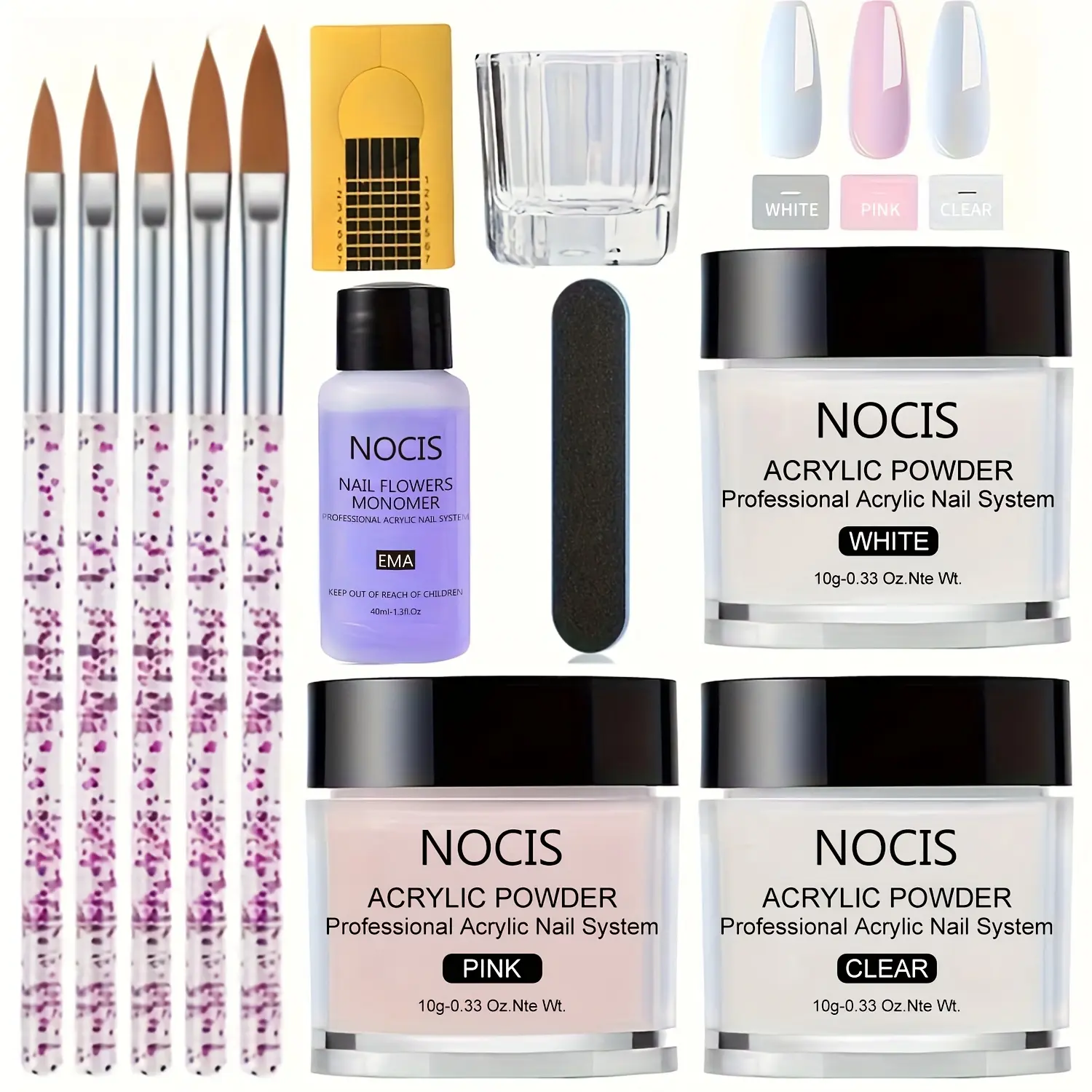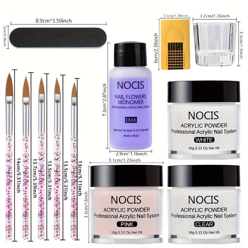 This kit is designed for nail extension and carving. The acrylic powders come in clear, pink, and white. The liquid monomer and nail brushes are included for easy application.