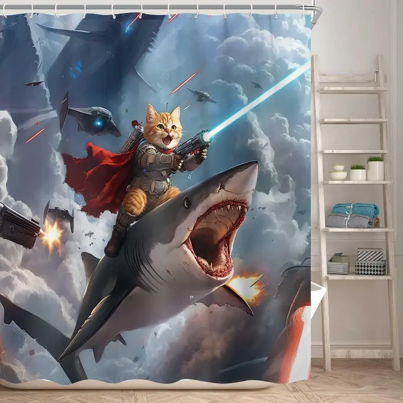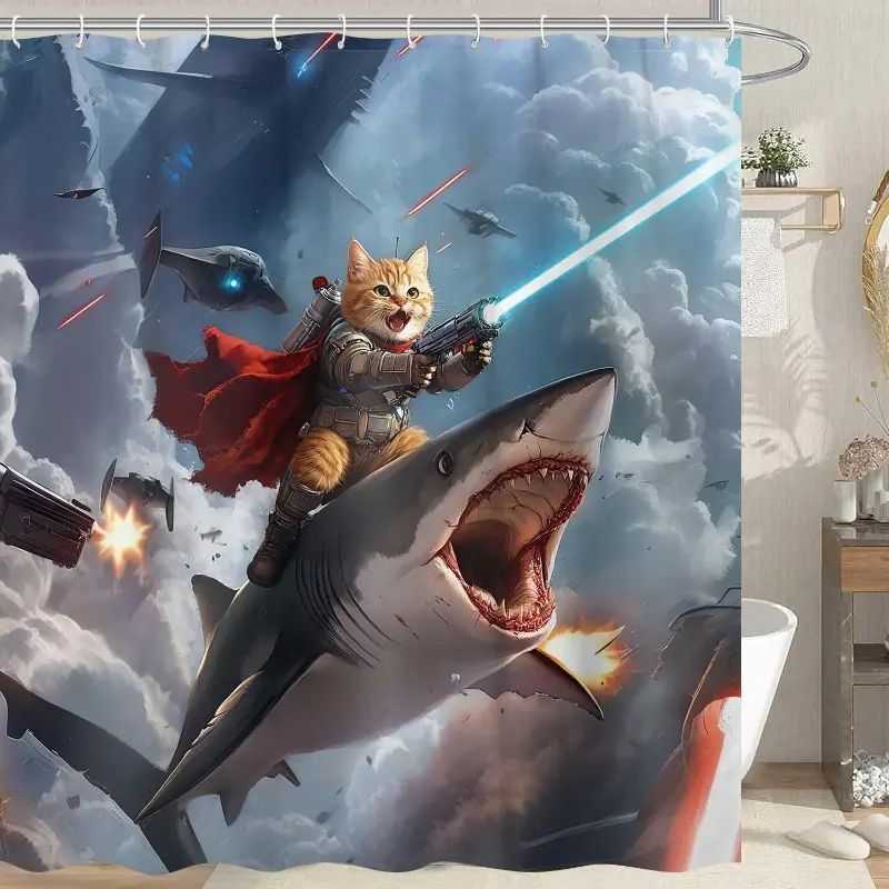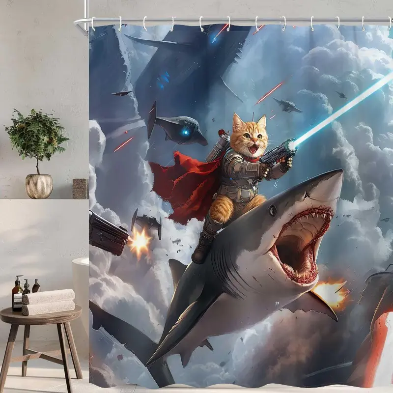 Funny Cat Knight Riding Shark in Space Battle Shower Curtain - Humorous Cat Laser Gun Galaxy Print, Waterproof Fabric Bath Curtain with 12 Hooks | Novelty Kids Bathroom Decor #showercurtain #catmeme #sharkdecor #spacecat #funnybathroom