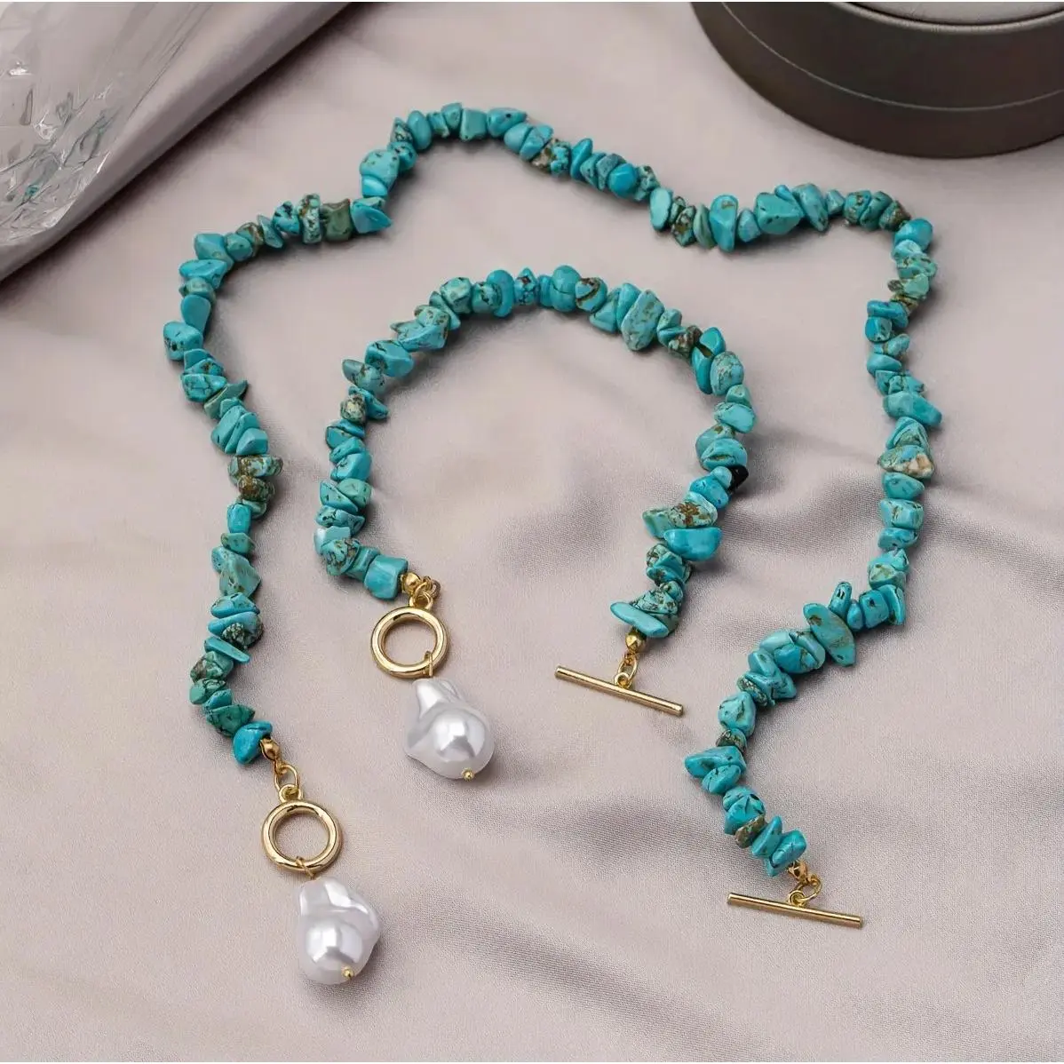 This set includes a necklace and bracelet, both featuring retro turquoise chips and baroque pearl pendants. Perfect for daily wear, these accessories add a touch of simplicity and fashion. The artificial pearl pendants are the focal point, offering a chic look. Ideal for women who appreciate handmade, elegant jewelry.