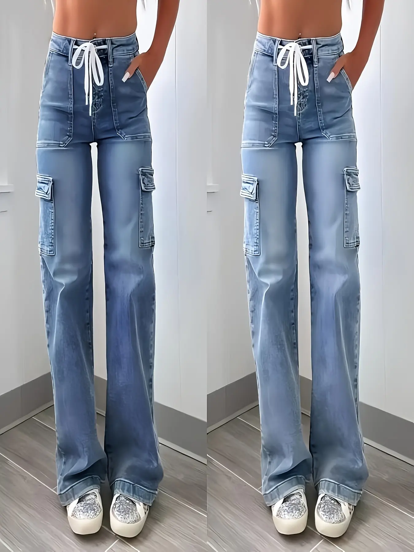 2026 New Style Women'S Leisure Straight-leg Jeans With Laces And Multiple Pockets.Casual Fashion Denim Fabric Sweatpants Jeans Fit Womenswear