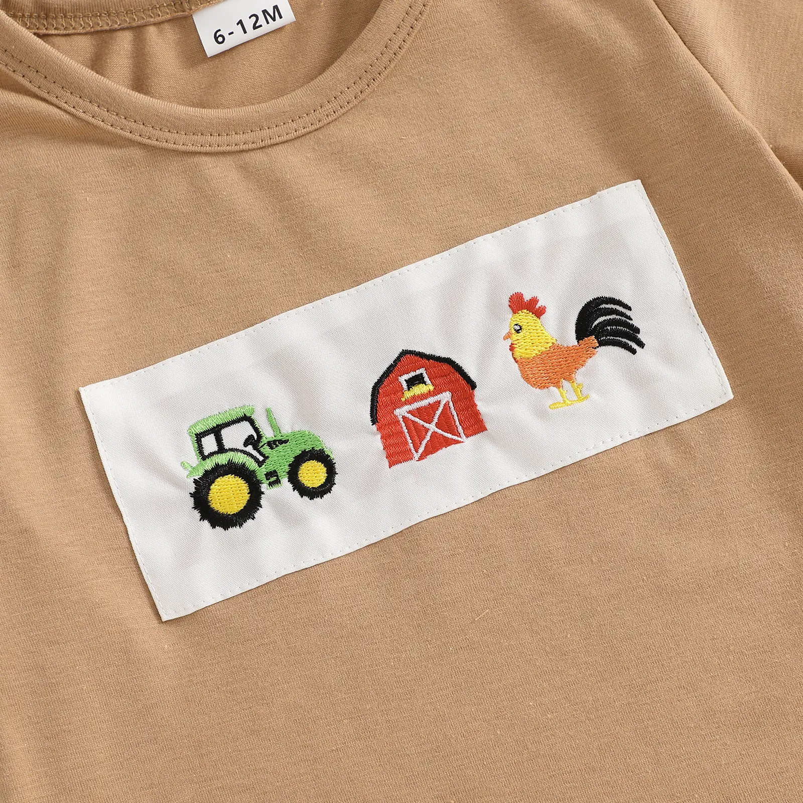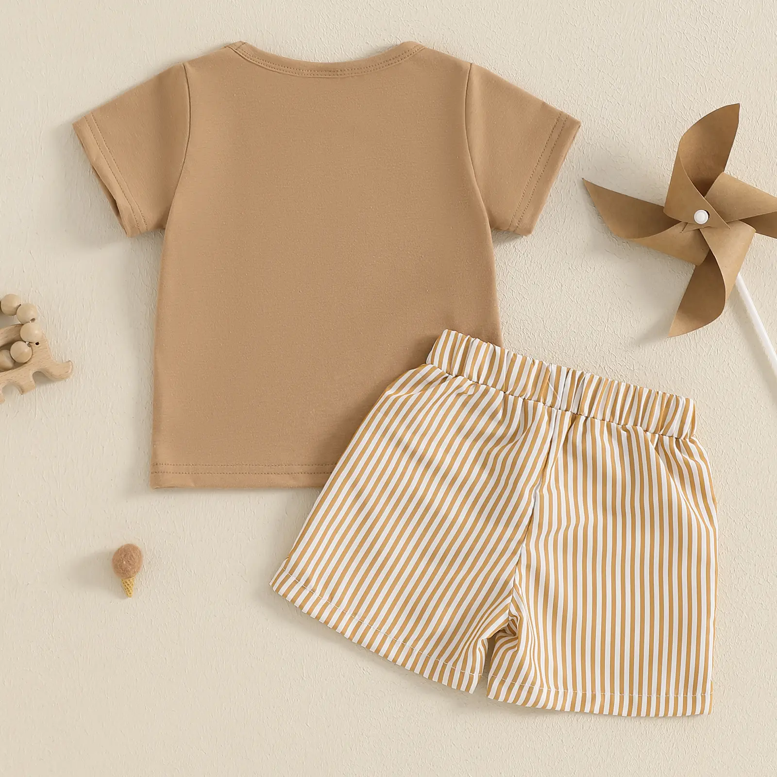 Toddler Boy Summer Outfits Animal Embroidery Round Neck Short Sleeve Tops with Stripe Shorts Outfit