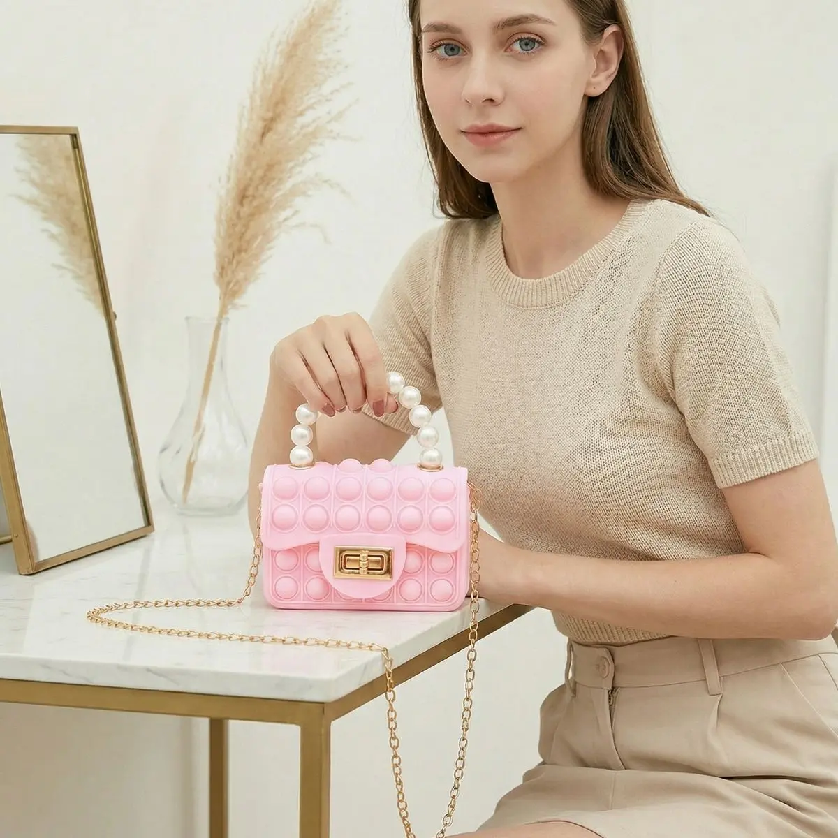 This isn’t just a cute handbag-it’s a satisfying fidget toy too!🧸Press the soft silicone bubbles, perfect for calming nerves, relieving stress, or just having fun on the go.Comes with a shiny pearl handle and a detachable gold chain, so you can carry it as a handbag, shoulder bag, or crossbody!