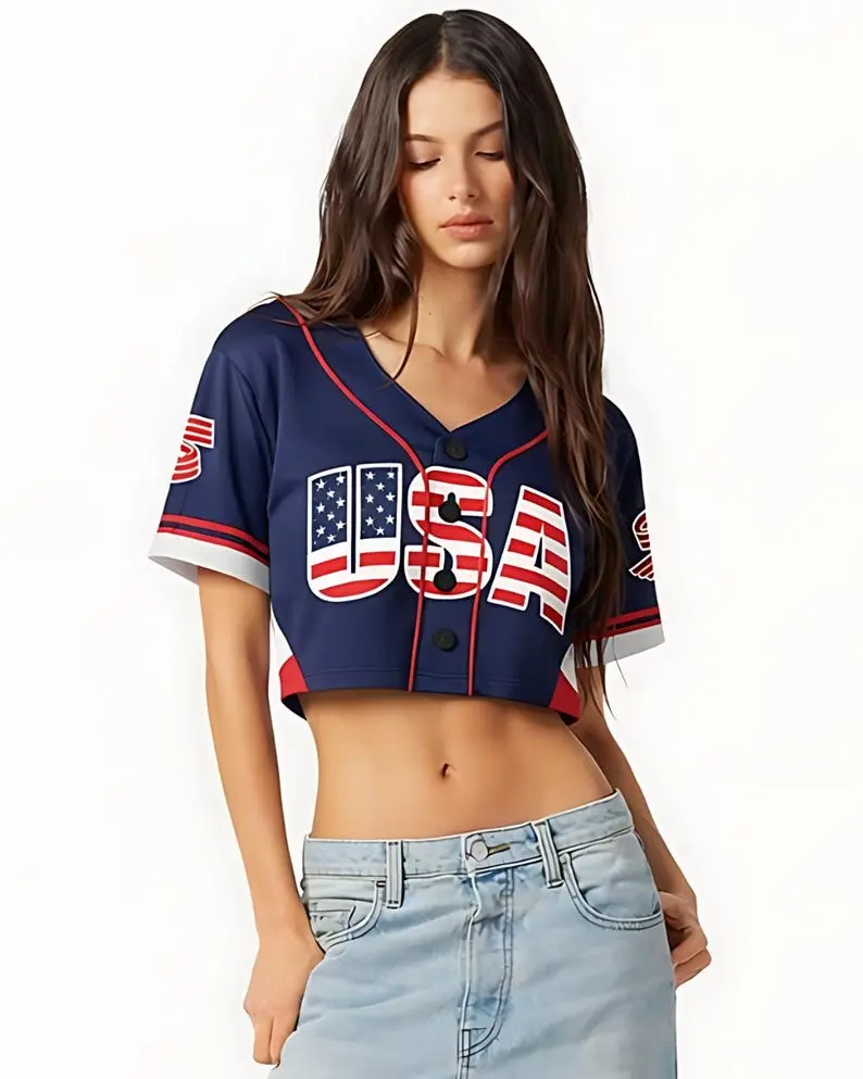 Show your America pride with this stylish USA Crop Top Baseball Jersey. Designed with a modern cropped fit and sporty baseball style, it's perfect for game days, concerts, or everyday wear. A great USA baseball gift for fans who love bold style and cultural pride