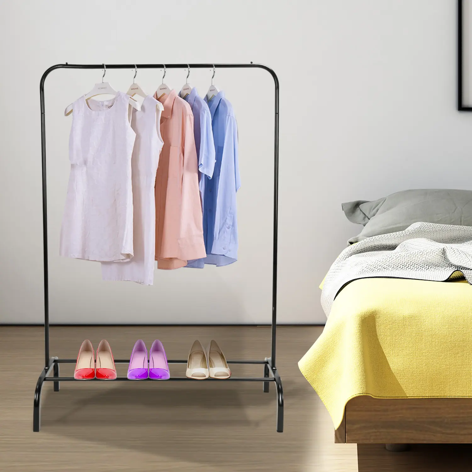 Say goodbye to messy chairs covered in clothes! This sleek rack easily holds your daily garments, while the bottom shelf is perfect for storing shoes, boots, or storage bins. Perfect for bedrooms, dorms, apartments, or even your laundry room.