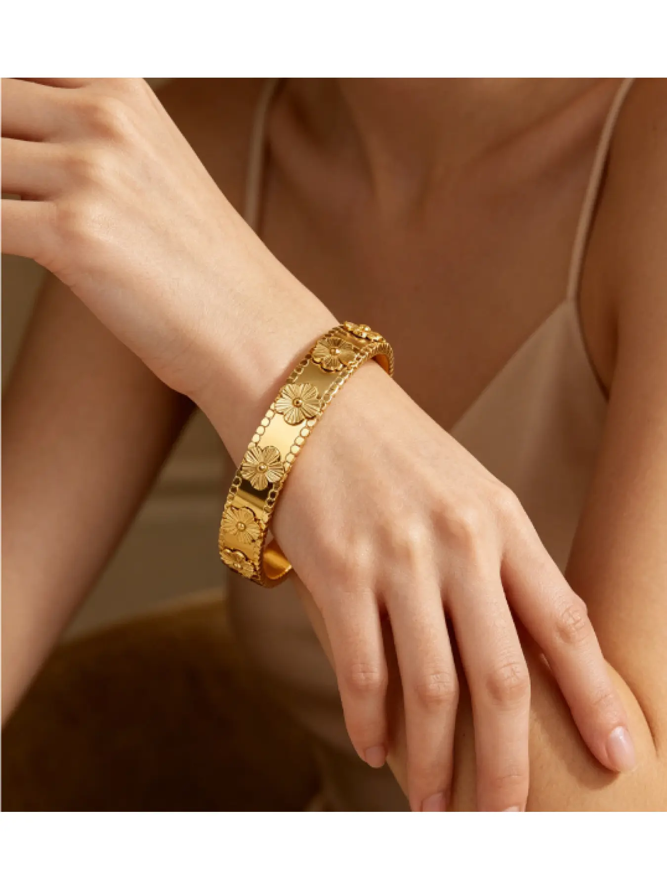 Vintage 4 Leaf Clover Gold Bangle, Non-Tarnish Stainless Steel Statement Bracelet, Daily Wear Jewelry