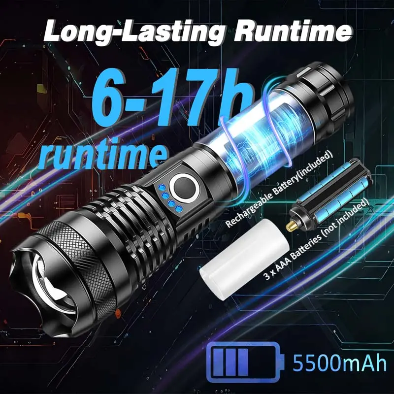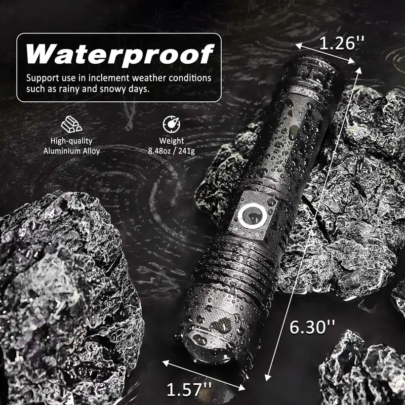 1500 Lumens ultra-bright LED tactical flashlight provides powerful and stable lighting for camping, hiking, emergencies, and daily use.