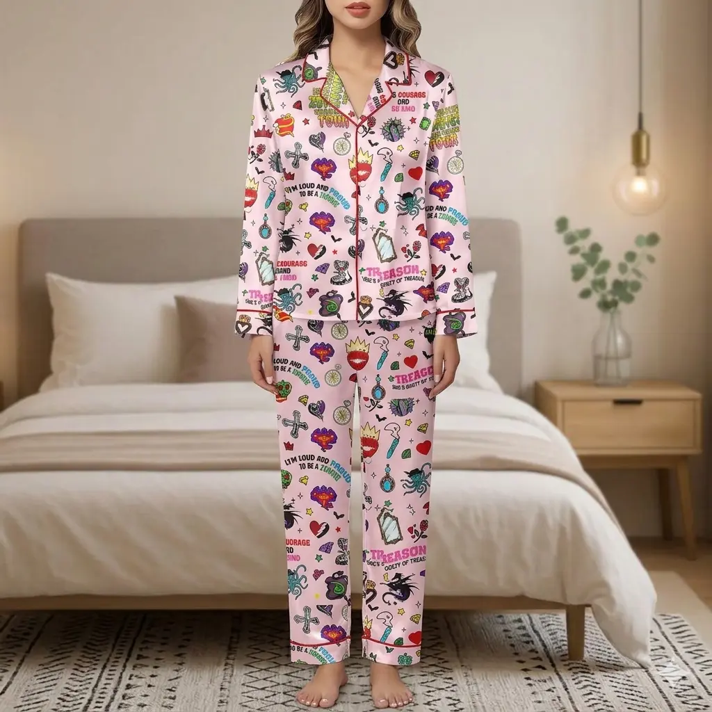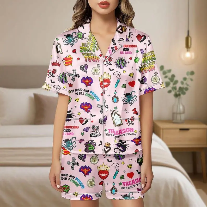 Descendants Zombies World Tour Satin Pajamas, Cute Heart Print Silk Sleepwear for Kids and Teens