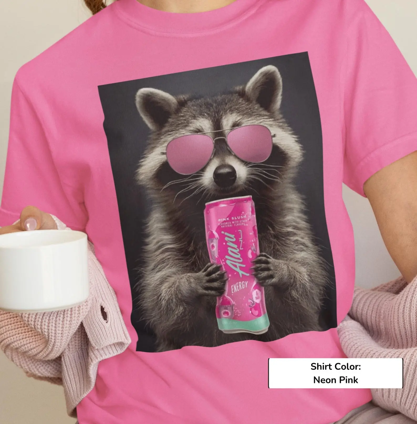 Raccoon Alani Nu Pink Slushi Animal Graphic T-Shirt - Sweatshirt - Hoodie, Gift For Alani Nu Lovers, Alani Nu Lover Shirt, Alani Nu Shirt, Alani Nu Lover Gift, Alani Nu 2026, Full Size, Full Color