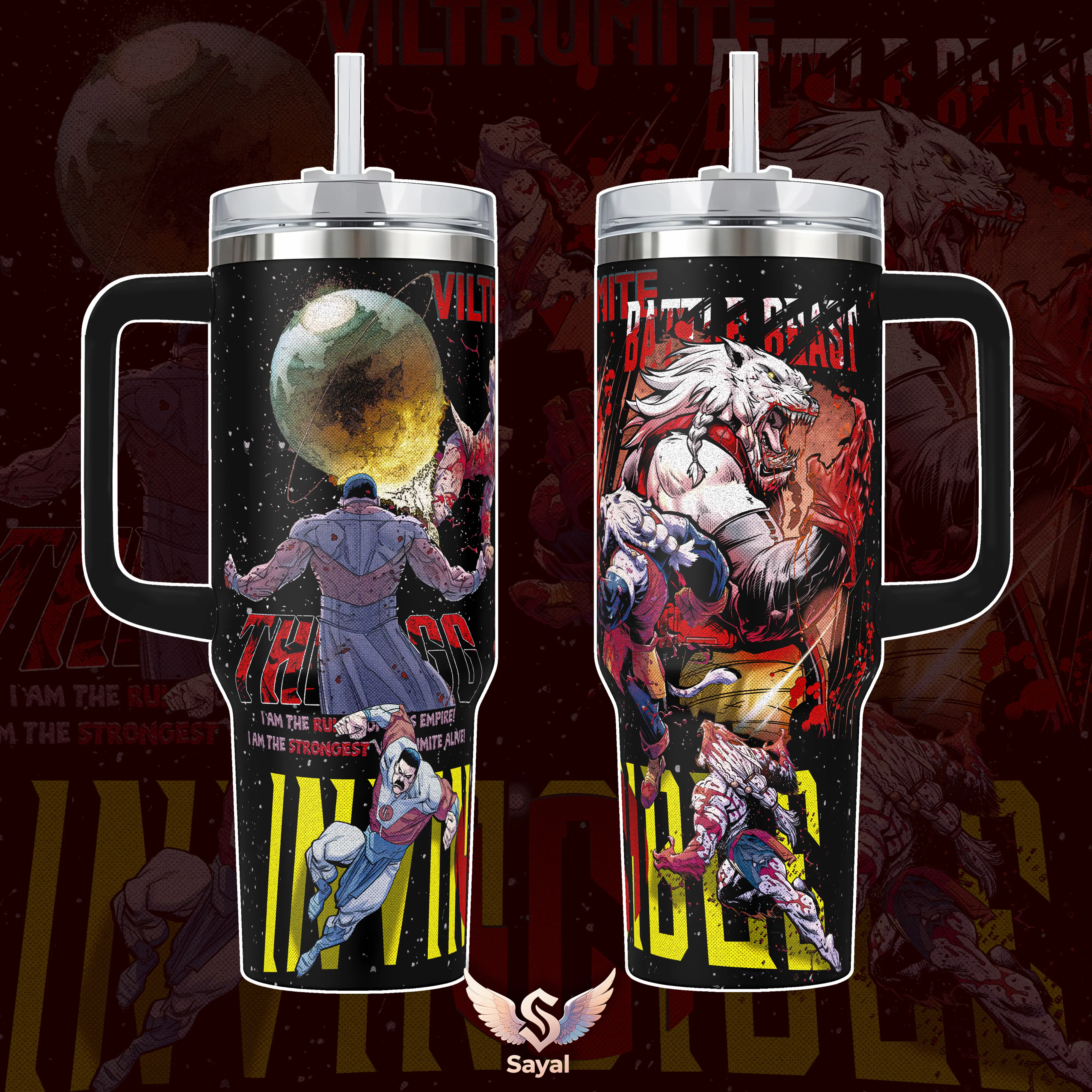 Thragg x Battle Beast Invincible Viltrumite Battle 40 oz Vacuum Insulated Tumbler with Handle Straw Omni-Man Comic Book Action Graphic Keeps Drinks Hot/Cold 12H+ 18/8 Stainless Steel Travel Superhero Fans & Comic Readers Aesthetic Merch