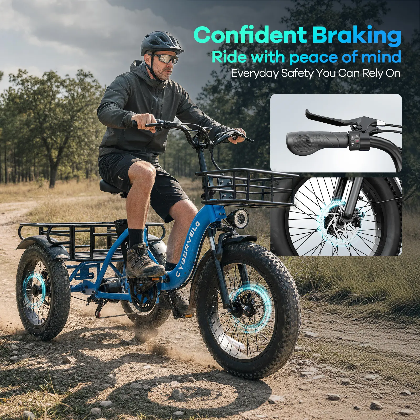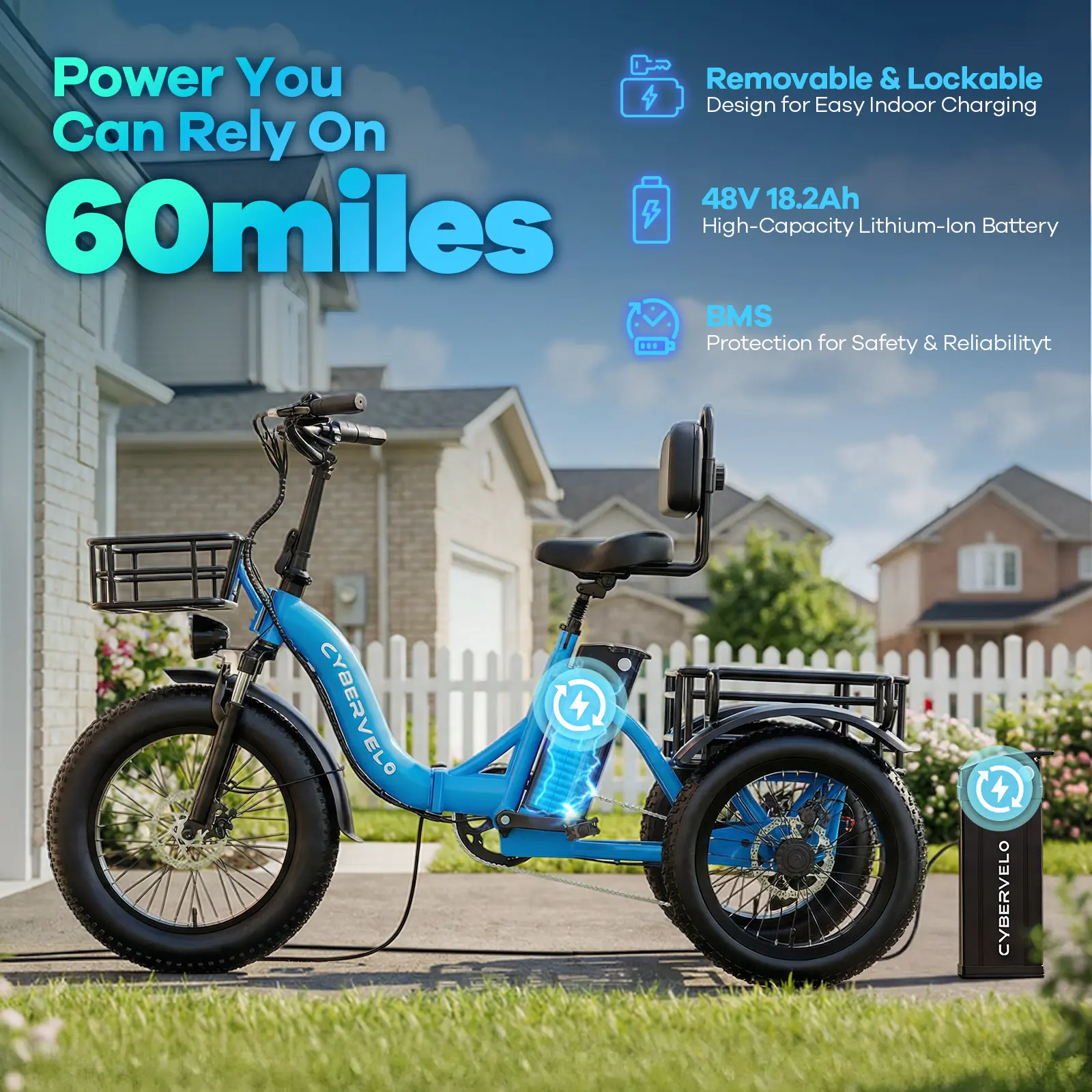 Discover the Cybervelo ebike C16, a three-wheeled electric bicycle perfect for adults. Front is 20inch 3.0 and the rear is 16inchs 4.0 tyre . It features a 48V20.8 Ah large removable battery, ensuring long-lasting power. The 20-inch bike comes with a convenient basket on front and rear, ideal for beach trips. Suitable for men and women, it offers all-terrain capability. Enjoy a one-year warranty for peace of mind.