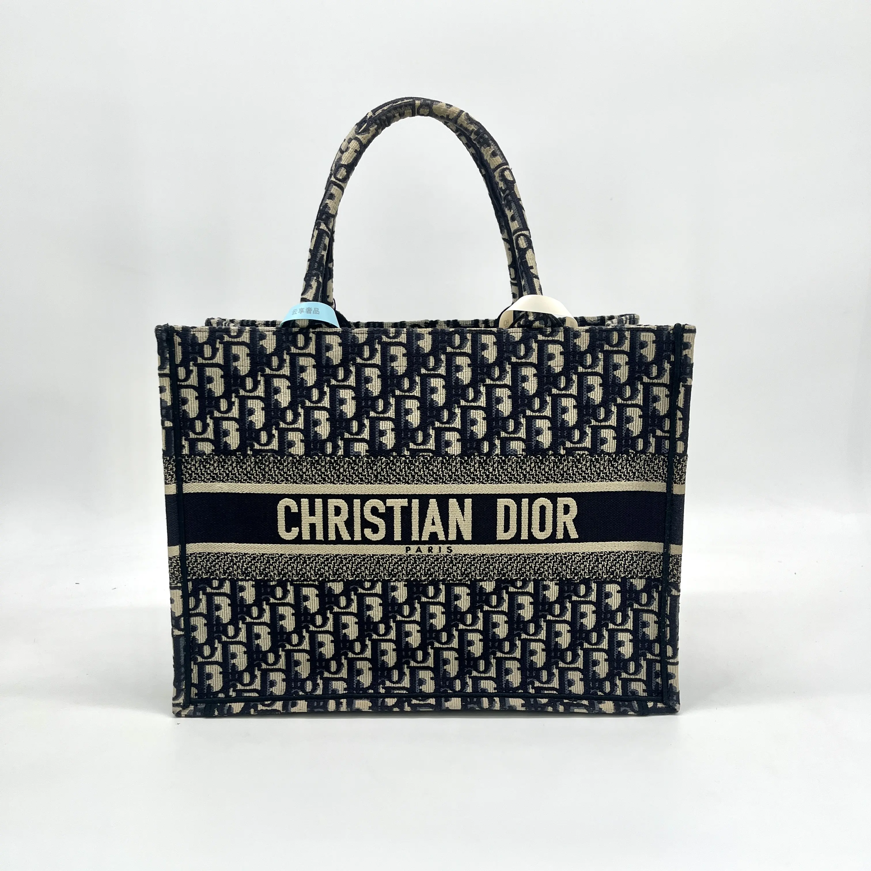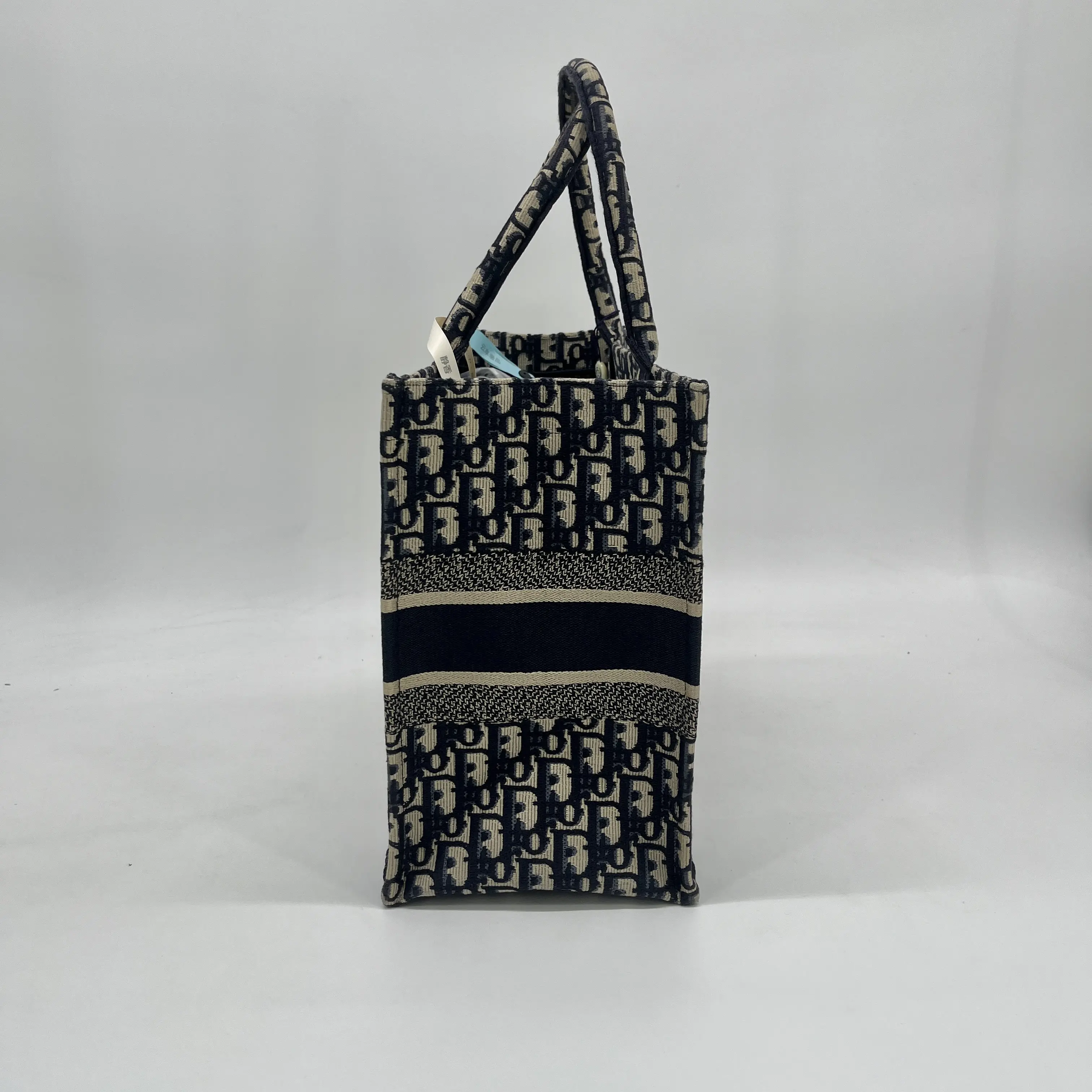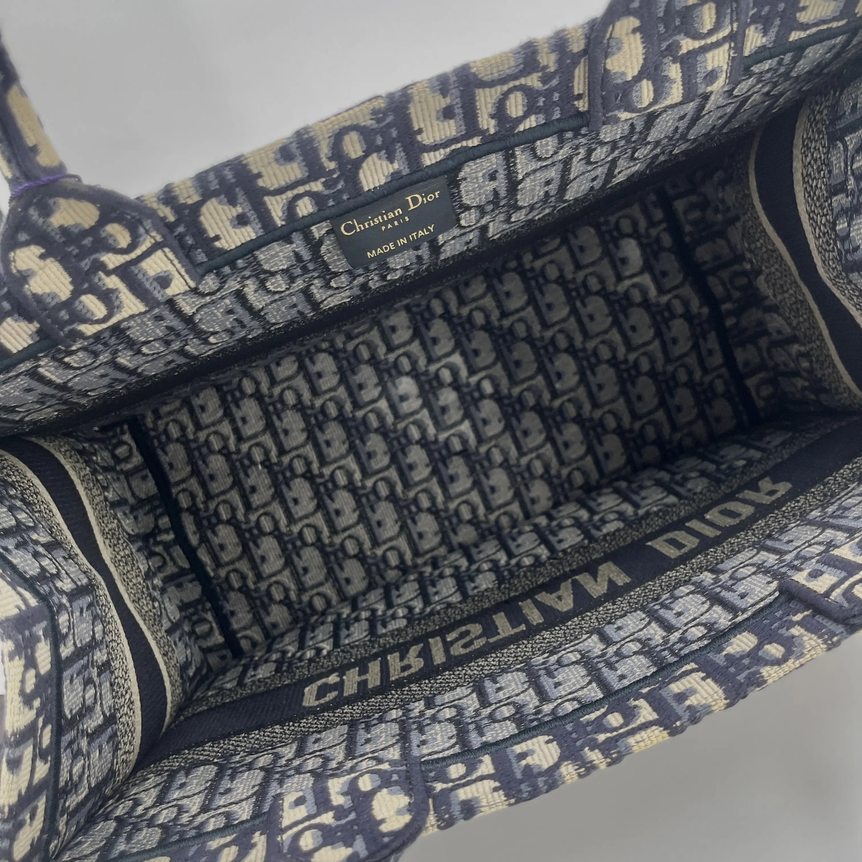 This is an authentic CHRISTIAN DIOR Oblique Medium Book Tote in Blue and Multicolor. This lovely tote is crafted of classic oblique canvas in navy and beige. The bag features rolled canvas top handles and a CHRISTIAN DIOR logo embroidered on the front.