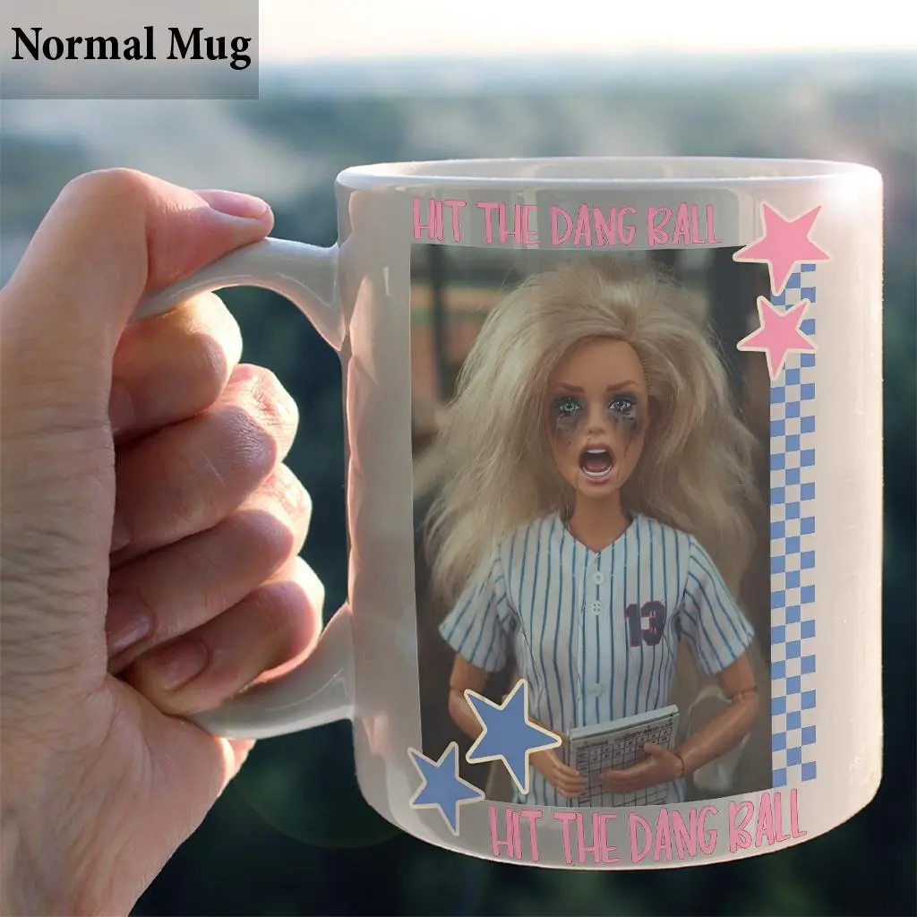 Hit the dang ball funny baseball mom mug, game day softball cup, distressed doll face meme coffee mug