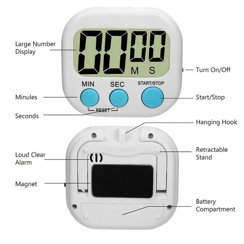 MAGNETIC BACK, RETRACTABLE STAND AND HOOK FOR HANGING - You have 3 different choices for placement of the Kitchen Timer. Either stick it to the fridge door with its large magnet, or use the pull out stand for table-top use, and finally you can run a piece of string through the hook and hang it on a wall hook or around your neck if you are on the go.