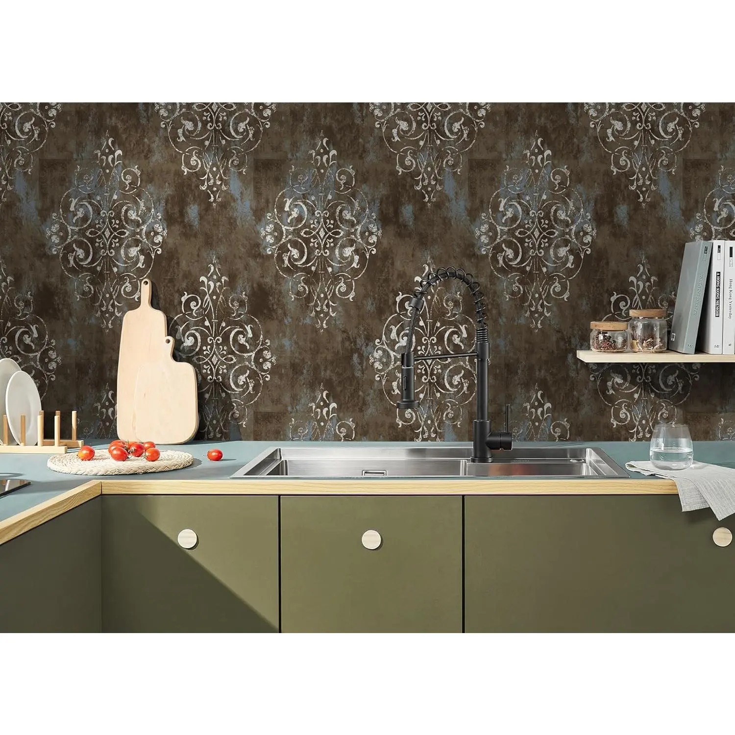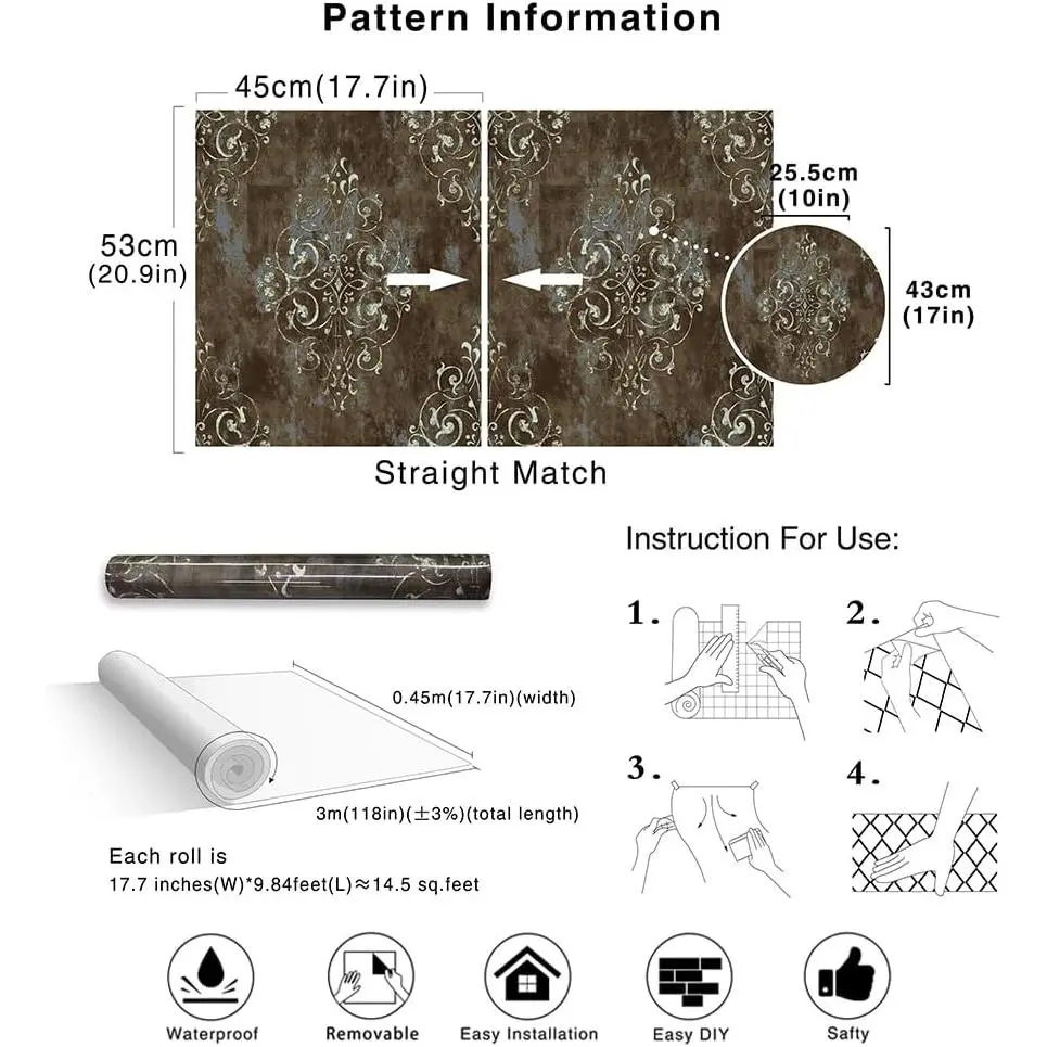 FEATURE:Quick and easy to install - Just peel and stick,no water,no paste,no mess!Good renter friendly room renovation idea.This wall paper was made by high quality print,eco-frindly ink,durable vinyl material,we have improved this wallpaper quality to be more strong and non transparence to avolid tearing&see through issue.This wallpaper also has matte finish,nice texture,waterproof and removable.There have grid and measurements on the backing paper, you can easily cut for your needed size.ROLL DIMENSION: 1 roll damask wallpaper = 17.7 inches wide by 9.8ft long, covers 14.5square feet.17.7" is the fixed wallpaper width of each roll, this size is perfect to install even just by one person.We are offering 2 sizes for this vintage victorian wallpaper, please choose "S" for small DIY projects and "L" for large walls, if the height of the place you would like use this peel and stick wallpaper is above 8ft, pls choose "L" size for this self adhesive wallpaper.PATTERN & DESIGN: Pattern repeat is H20.9" x W17.7" (H53cm x W45cm), straight match.Firstly to find the correct pattern repeat and then just directly match without overlap, it's very easy for beginner who never did peel and stick wallpaper before.This vintage damask peel and stick wallpaper is gorgeous, it has antique brown background, with some teal blue brush and retro white drawing, such a beautiful vintage wallpaper, it's a great choice for french country style kitchen, bedroom decorationDIY Creative Decor: This self adhesive wallpaper apply process is very easy just like a big wall sticker, it can be used for any smooth walls like living room,bathroom,powder room,nursery room for boys/girls,laundry,accent wallit also available for kitchen backsplash, shelf liner, cabinets, drawers, countertops, bookshelves, closet shelving, flooring, stair risers, windows, frames, locker, pantry areas, Christmas/Halloween holiday home decors and anywhere you like to stick on.WARM TIPs: This peel and stick wallpaper has a great weight and thickness, it's much thicker than regular contact paper.Please use on any clean, dry and smooth surface and buy enough rolls at a time to make sure they come from the same batch to avoid color variation.⚠Attention: The texture or dirty surface may impact wallpaper stickness performance!