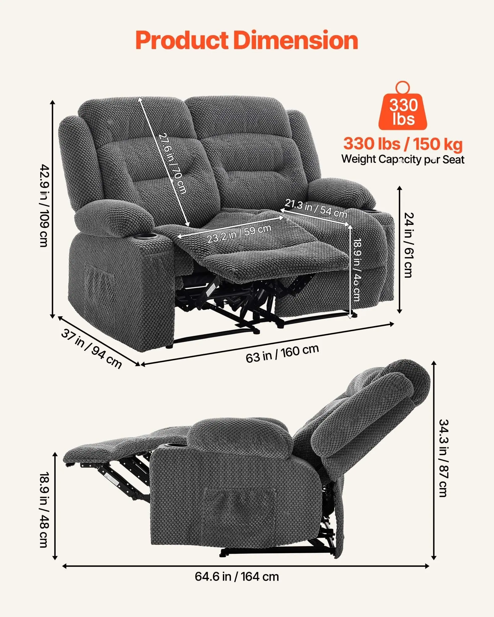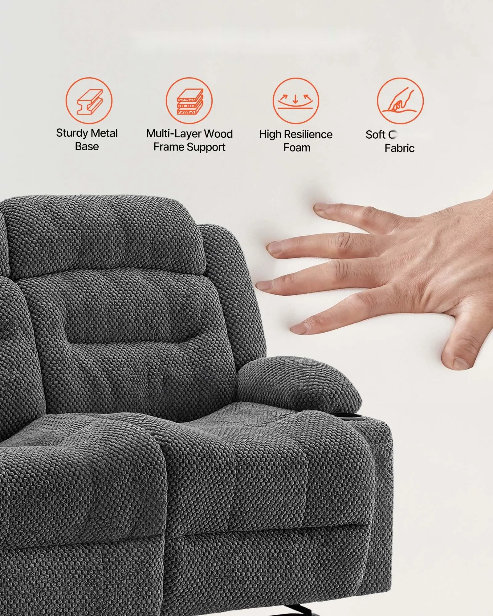 ·Adjustable Recliner Loveseat: This loveseat recliner sofa creates a relaxing space. Pull the lever to adjust from 110° to 145°, allowing you to sit upright or recline. Each seat is independently controlled, offering personalized comfort for you.
