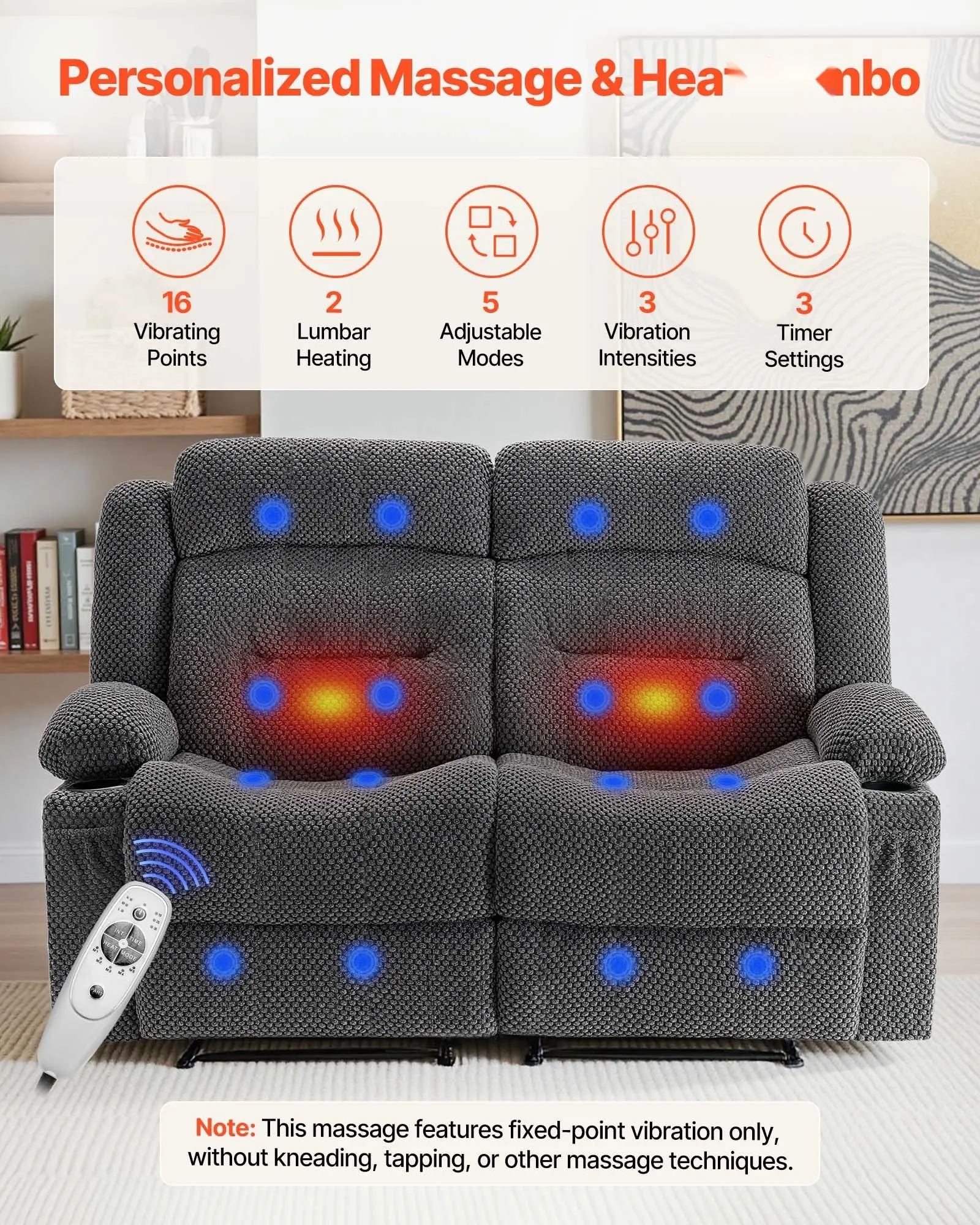 ·Vibration Massage & Lumbar Heating: Each seat features 8 vibration points and 1 lumbar heater with 5 adjustable modes, 3 intensity levels, and a timer function. The lumbar heating enhances circulation, and the system auto turns off after 10, 20, or 30 minutes