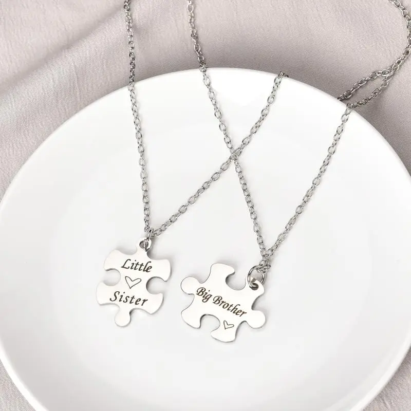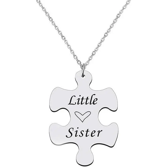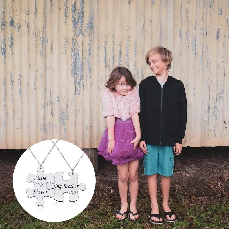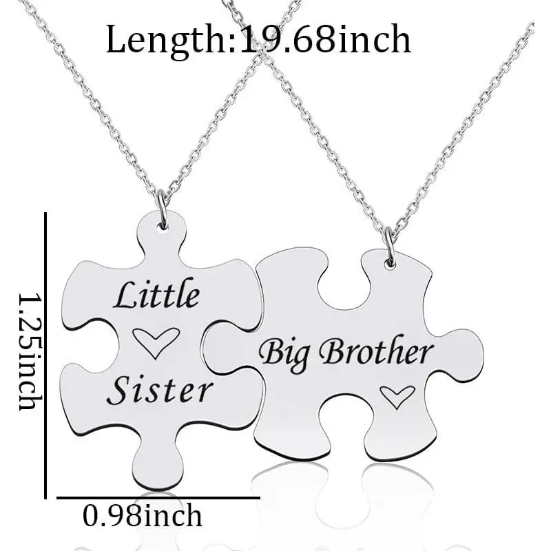 Big Brother Little Sister Gifts for Women Men: This puzzle brother sister necklace is engraved with warm letter "Little Sister Big Brother", and the engraved necklace for sister brother is divided into two parts, and without either part, it will not be complete, which means you are my most important brother or sister, funny gifts for men womenBest Quality of Matching Necklace for Little Sister Big Brother: The brother necklaces are made of stainless steel, will not rust and very practical, can accompany him for a long time, puzzle piece necklace for men women will always keep with him or her, give them spiritual comfort, remind that you always miss them, best little sister ever gifts from big brotherBest Sister Brother Gifts for Men Women: When little sister and big brother are not in the same place or school, they will miss each other very much, sis bro gift for woman man can help them to stay connected with each other, sister necklace gifts from brother can express your missing, puzzle pieces necklaces for sisters, great long distance friendship gifts for sister brother you can't missPortable Size of Cute Necklace for Brother Sister: The size of each puzzle necklace pendant for sister brother is approximately 1. 18 * 0. 78 inches, weighing about 8 grams, and each lil sis necklace chain is equipped with a 23. 62 inch long chain, which is easy to adjust the length of the puzzle necklace for little sister big brotherMeaningful Sibling Necklace Gift for Little Sister Big Brother: The big bro necklace can be presented as birthday gifts for little sister, christmas gifts for big brother, sister graduation gifts from brother, big brother gifts from litter sister, your sister or brother will most definitely cherish this meaningful gift that constantly remind them you love him or her