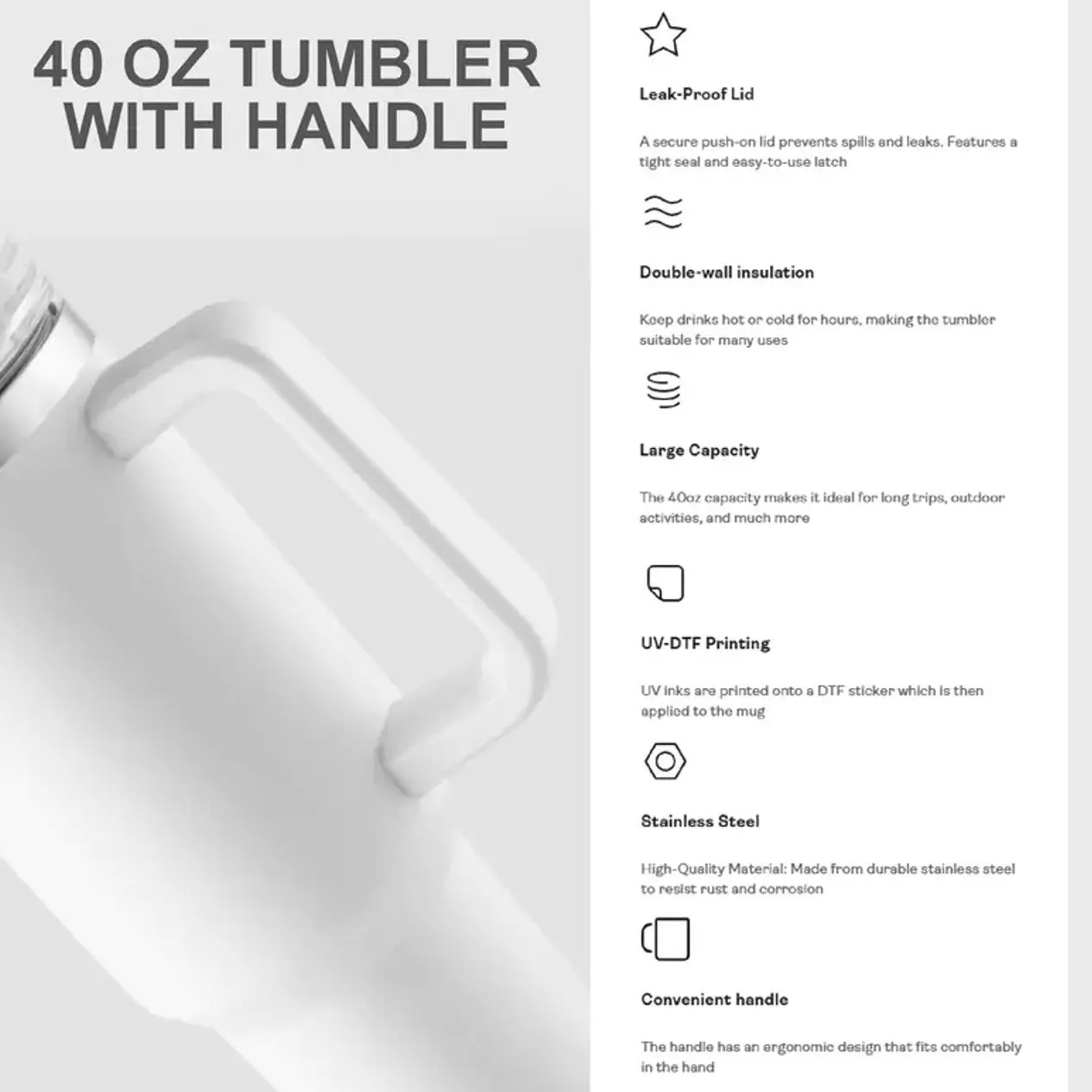 Ergonomic Handle (40oz): Designed for easy carrying all day long.