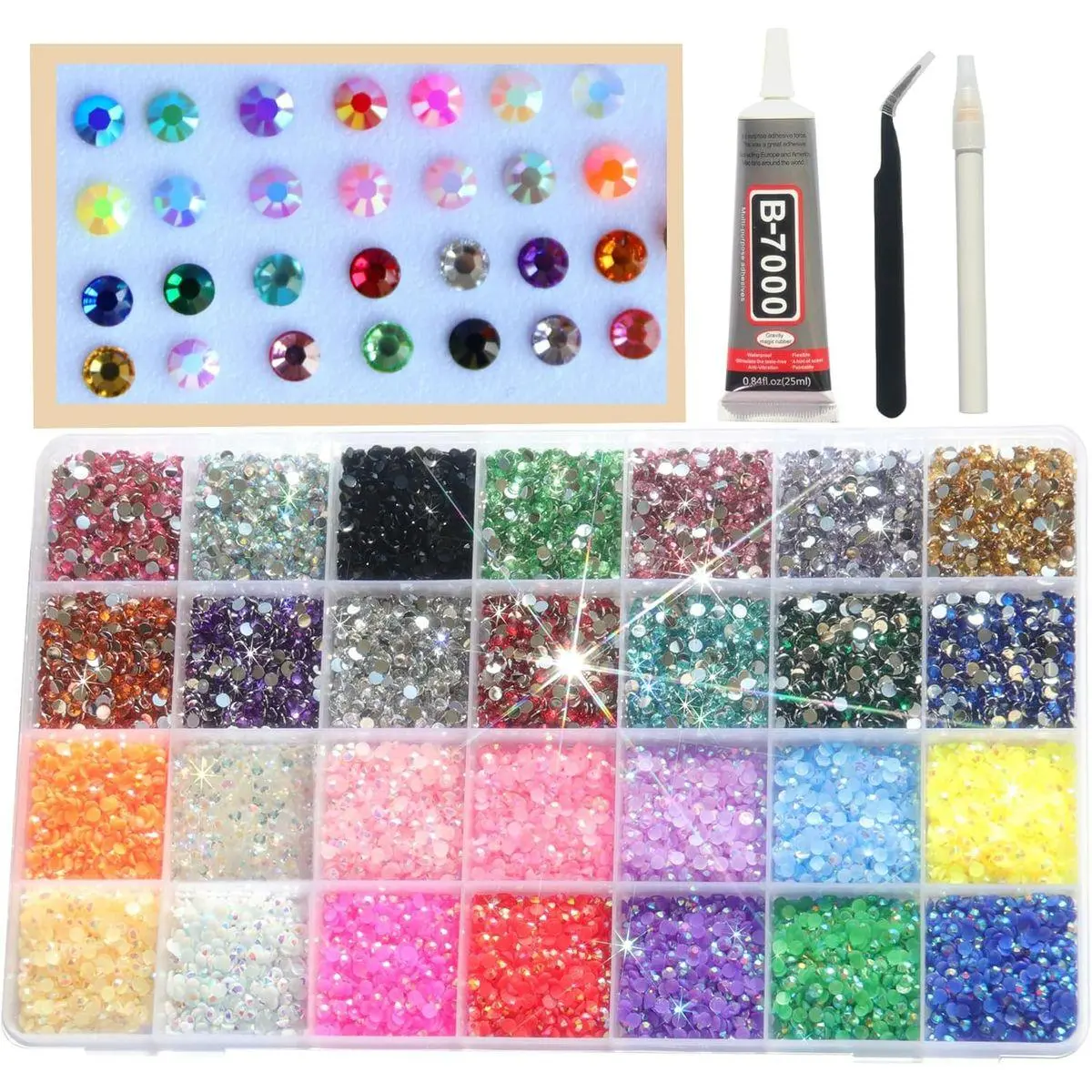 Bedazzler kit with rhinestones---The package includes 1 box with 28 grids, piedras de cristal para decorar featuring a variety of colors, approx. 26000 pcs of 3mm bling-out resin rhinestones (Mixed-Color). bottoms plated and bottoms non-plated.1 tweezers and 1 pickup pen are included for easily picking up of rhinestones. B7000 adhesive jewels glue for jewelry making. The large amount will support you to fulfill a number of your wonderful DIY decoration ideas with bedazzled kit