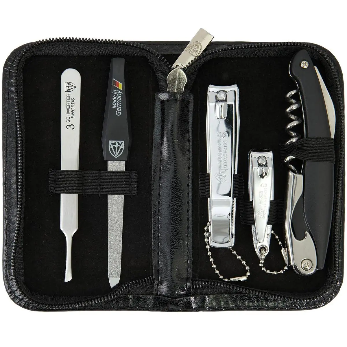 CONTENTS: Tweezers, bottle opener/foil cutter/corkscrew, nail clipper, toe nail clipper, sapphire nail file.