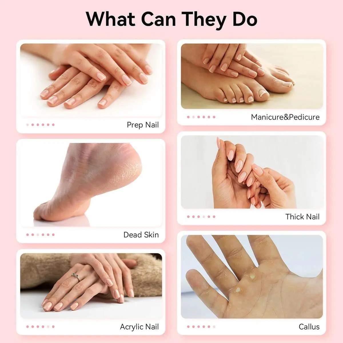 Various Grit Options:80 grit remove the gel overlays or shorten the acrylic or artificial nails easily. 120 grit helps you to prep the nail quickly, file the nail sidewalk, shape, and smooth. 180 grit comes with a smooth surface and it will perfect on the natural nail and cuticle with your file's low speed. 240 grit helps you smooth and polish your nail surface to shine