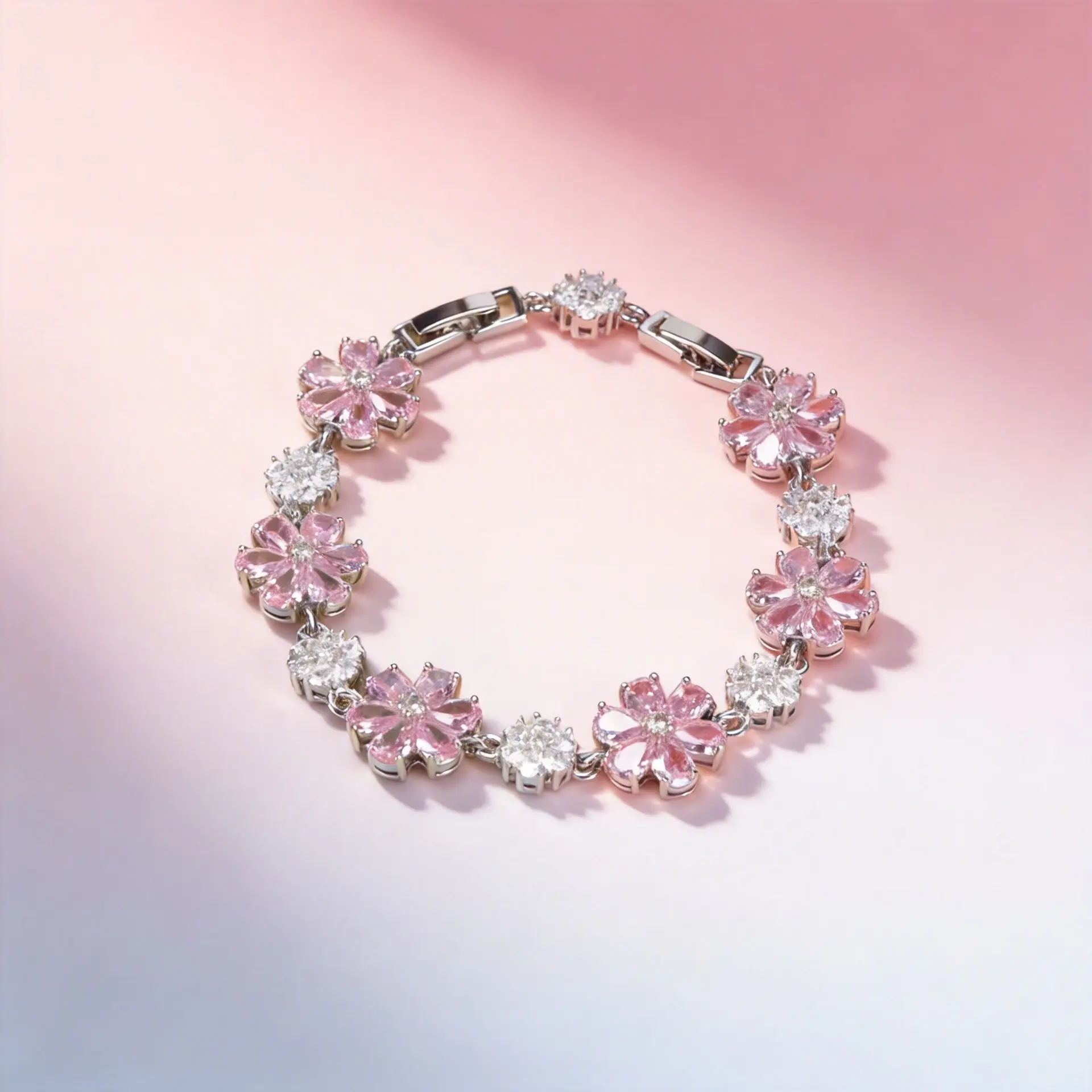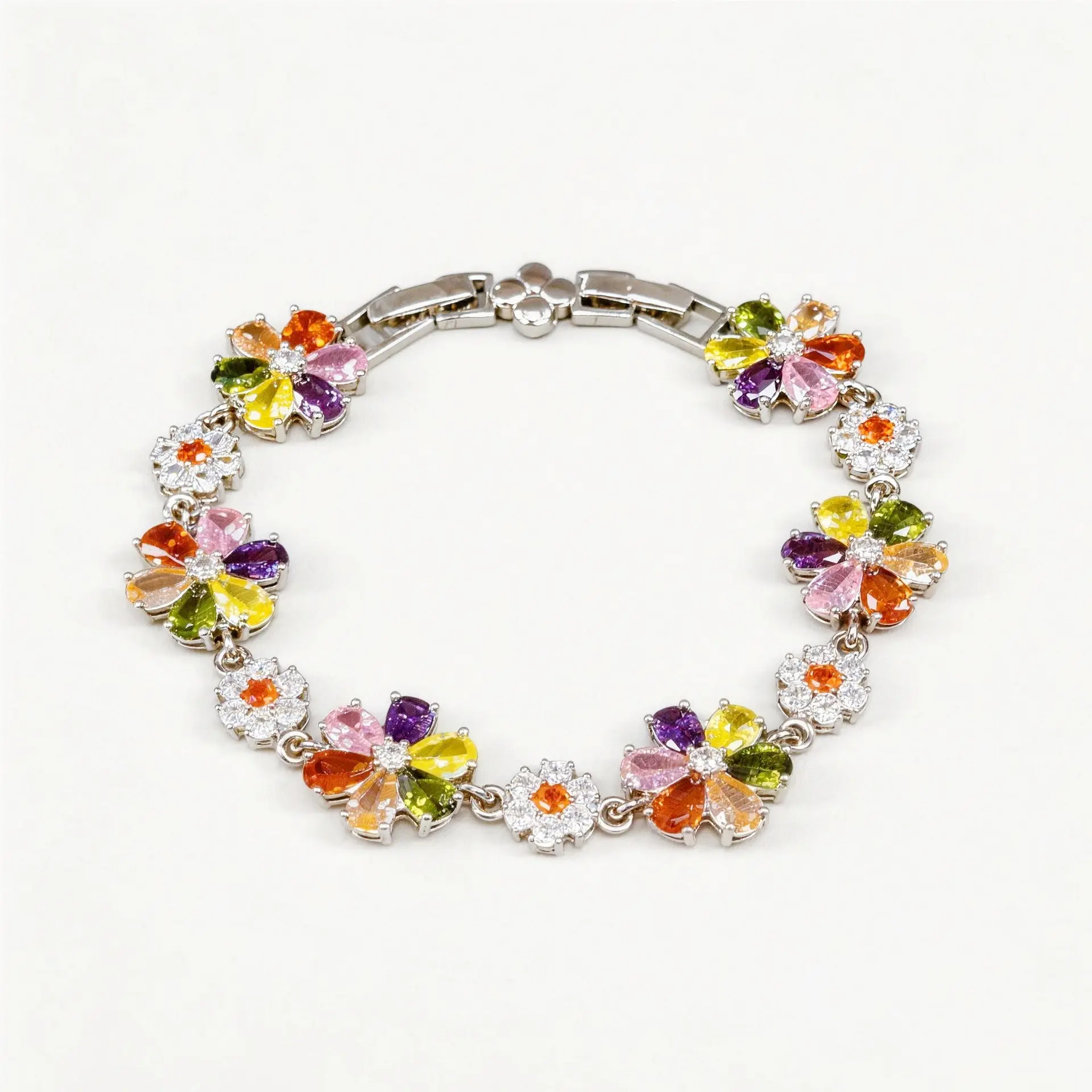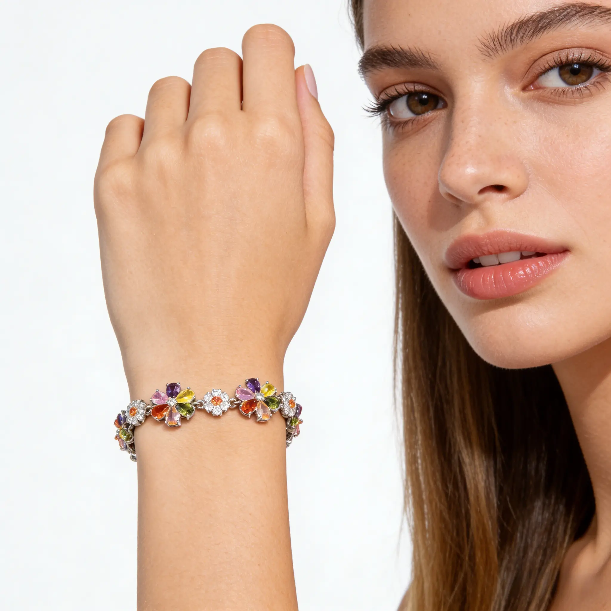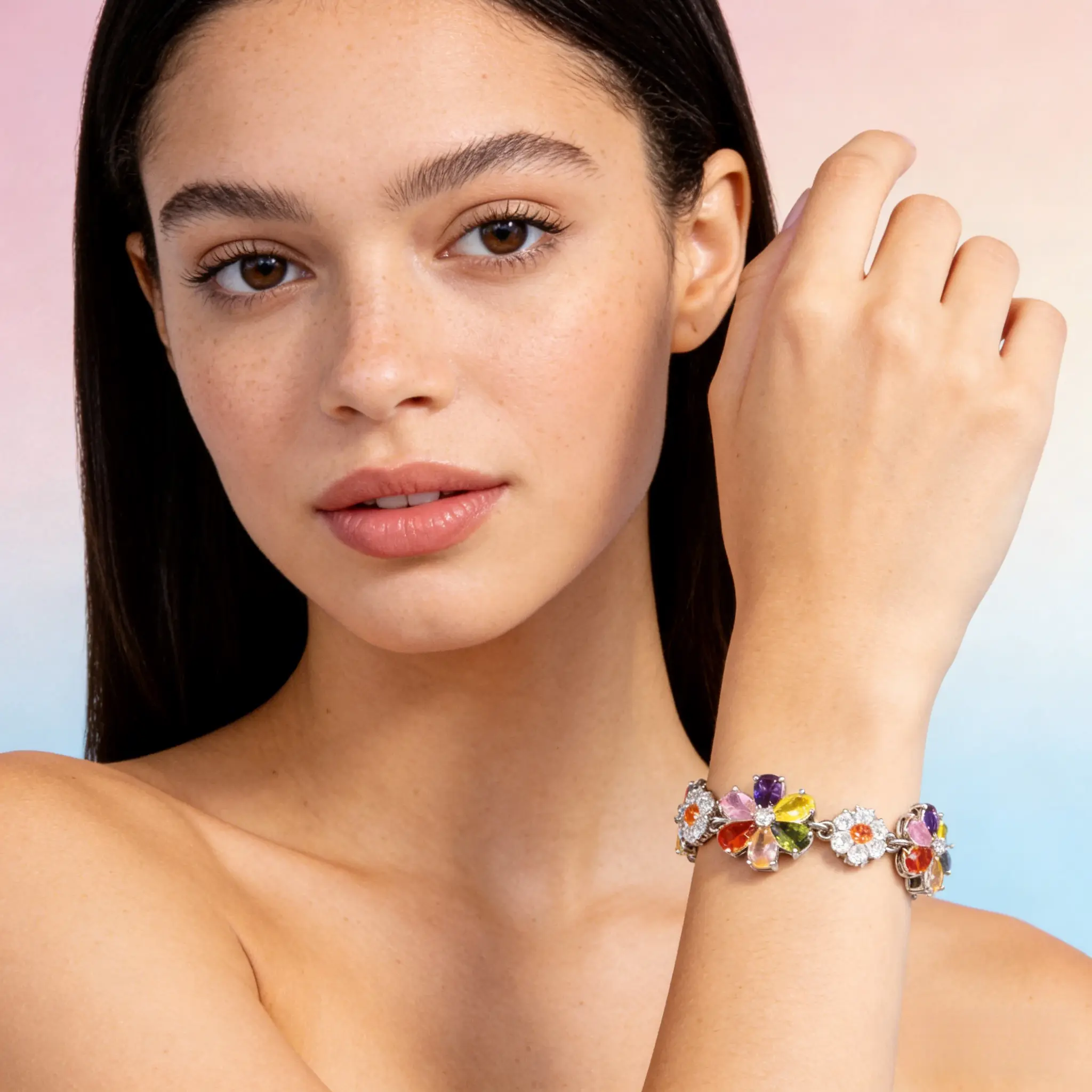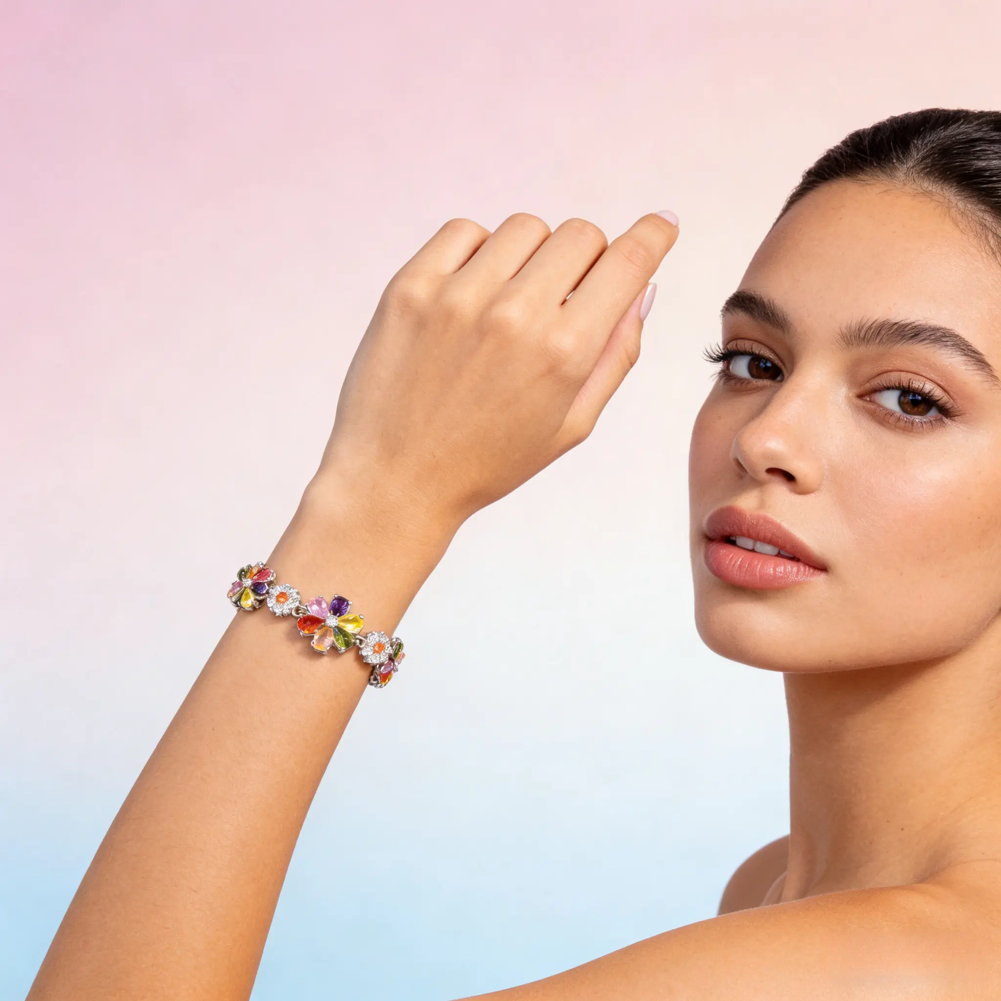 Crafted with brilliant, multi-colored cubic zirconia stones arranged in delicate floral motifs, this dainty silver-plated tennis bracelet catches the light with every move, turning heads whether you’re dressing up for a date night, brunch with friends, or adding a little luxury to your daily routine.The hypoallergenic, nickel-free silver plating ensures all-day comfort, even for sensitive skin, while the secure box clasp keeps it safely in place all day long.