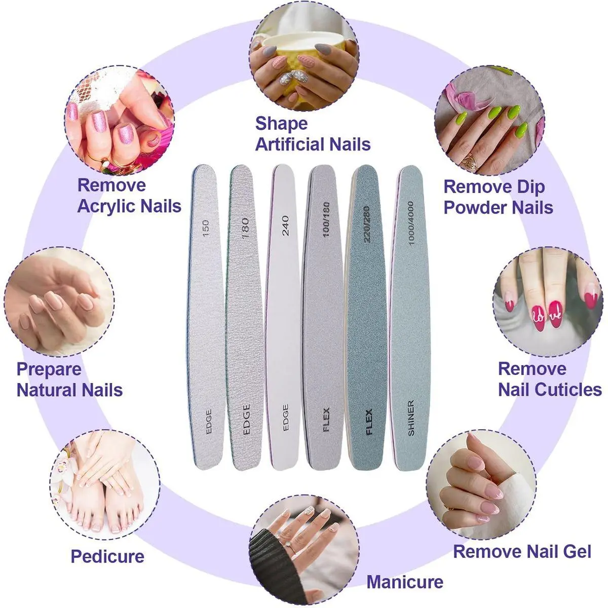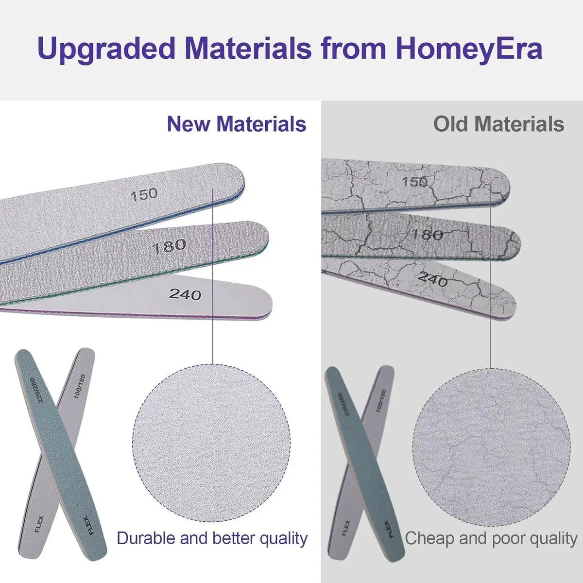 What You Get: You'll receive a set of 6 grit nail files, each equipped with double-sided 150/150, 180/180, 240/240, 100/180, 220/180, 1000/4000 grit from HomeyEra. We have full confidence in the superior quality of our nail files. Treat yourself to the pleasure from top-tier professional nail files.