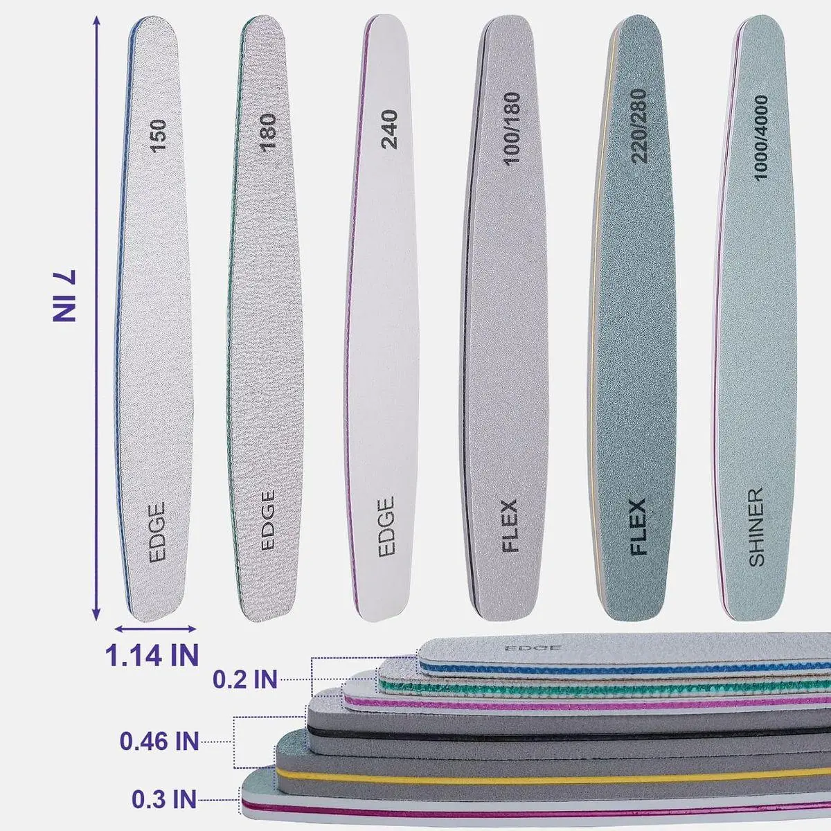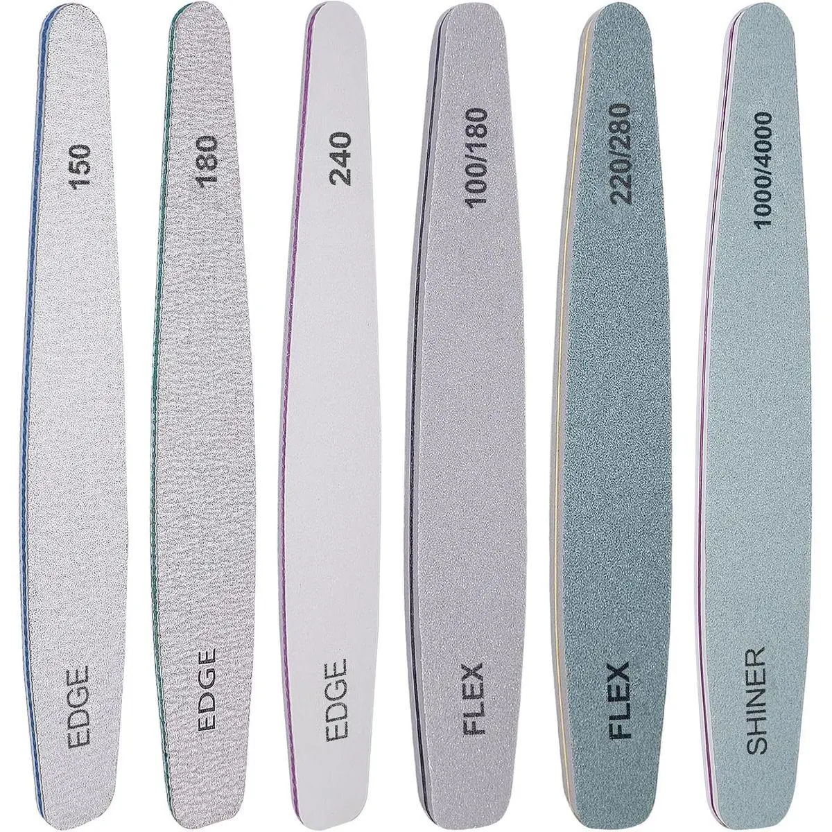 Different Grit Levels: Our nail file and buffer set offer various grit options, ensuring you have everything you need for flawless nail care. From soft nail files (150/180/240 grits) to a high-quality nail filer and buffer set (1000/4000 grits), these nail buffers include EDGE 150 grit Cushioned Board, EDGE 180 grit Cushioned Board, EDGE grit 240 Cushioned Board, FLEX 100/180 grit Buffer, FLEX 220/280 grit buffer, FLEX 1000/4000 grit Shine butter.