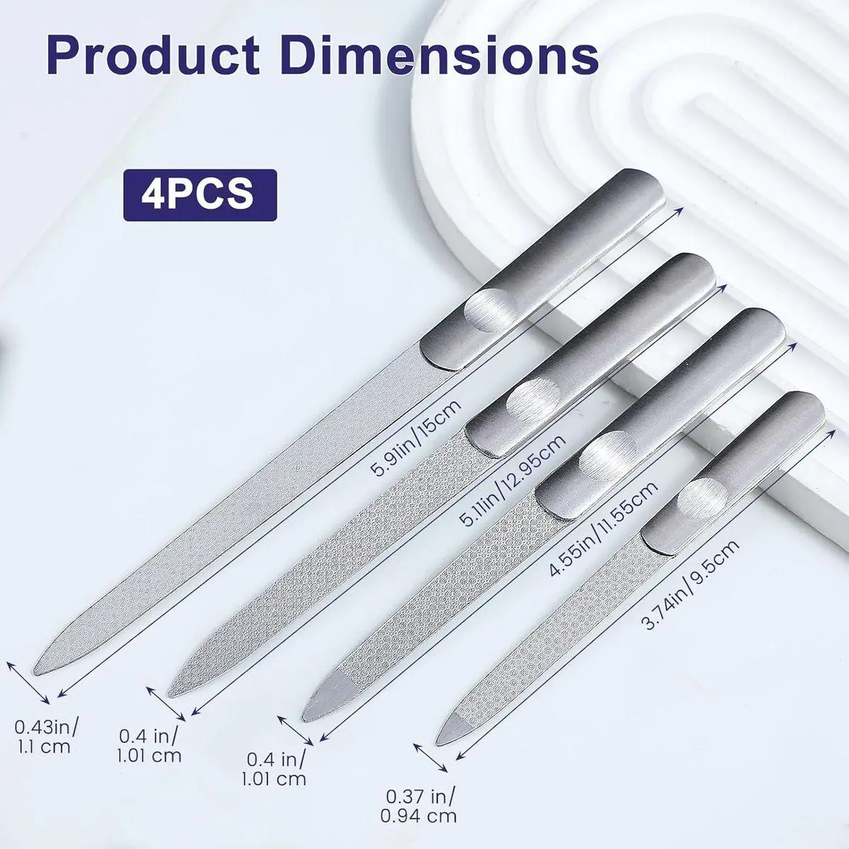 Comprehensive Nail File Kit with Multiple Sizes:This collection includes four stainless steel nail files ranging from 9.5cm to 15cm, offering varied options for different nail care needs and user preferences.
