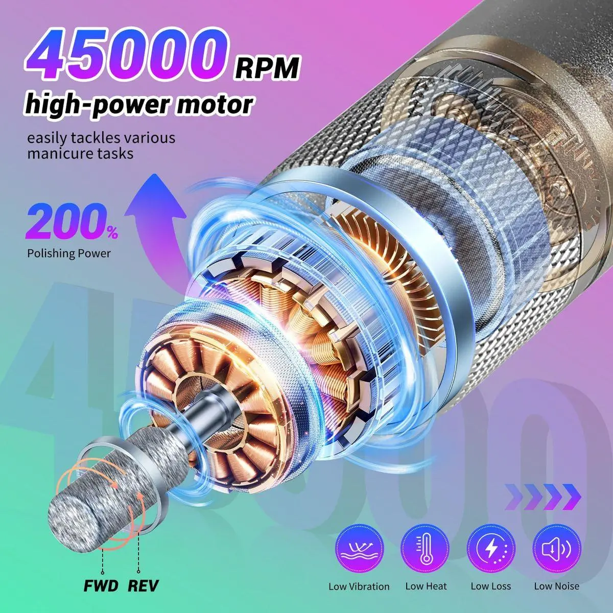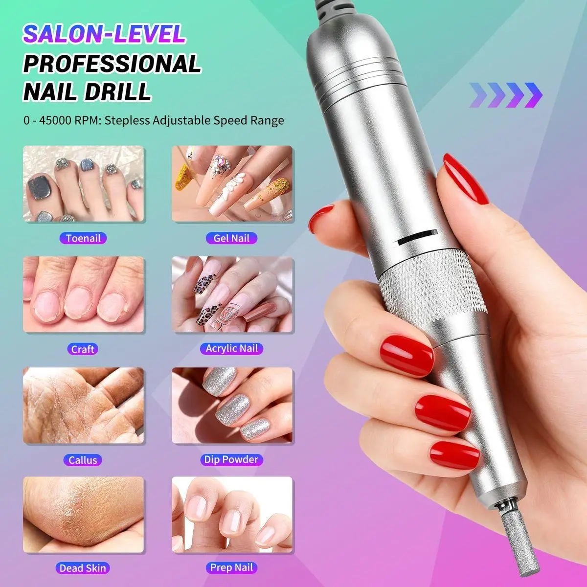 High Speed Up to 45000RPM:This professional nail drill is fitted with a high-quality motor, supporting smooth operation at an adjustable speed range of 0-45000 RPM—easily controlled by rotating the speed knob. It is an ideal tool for both salon professionals and beginners looking to create nail art at home or in salons.